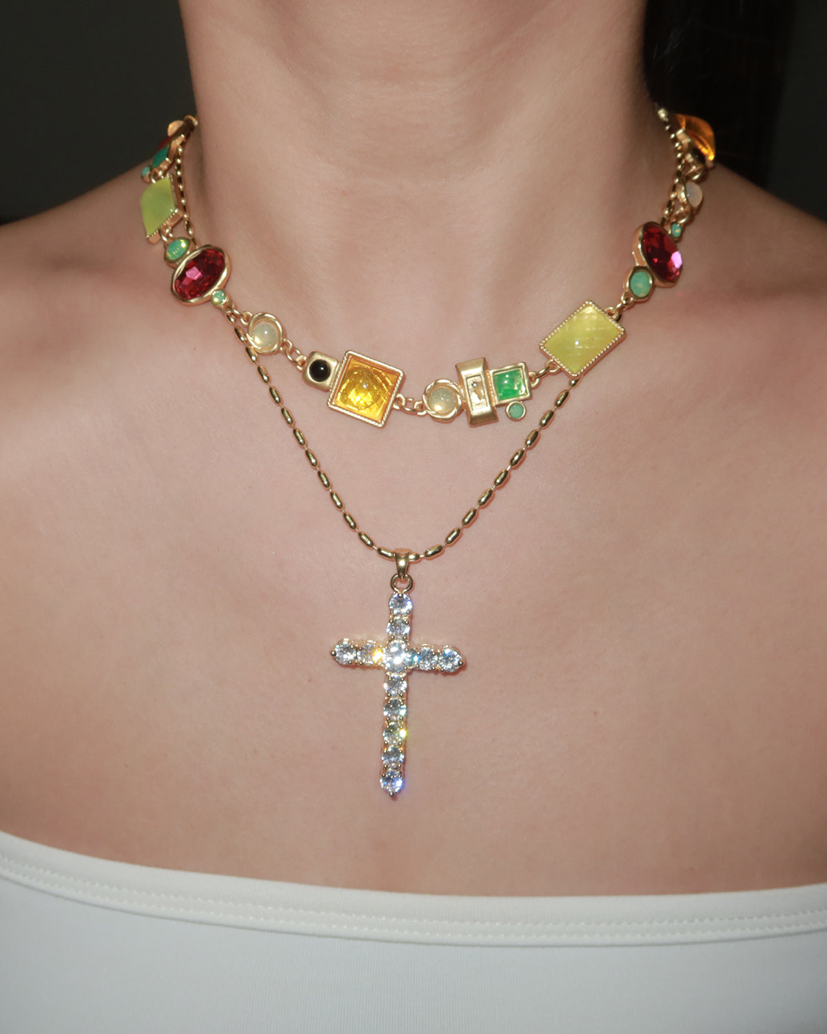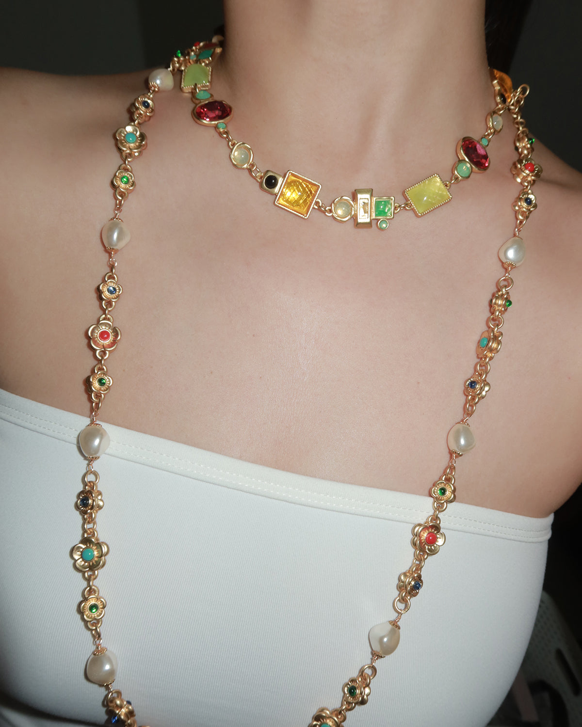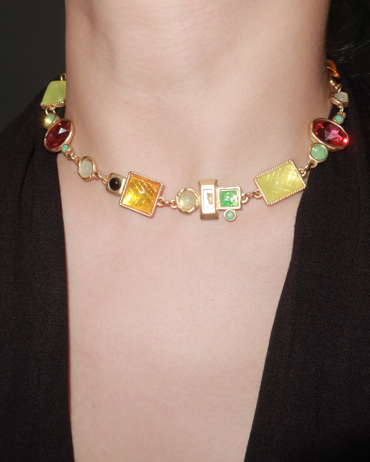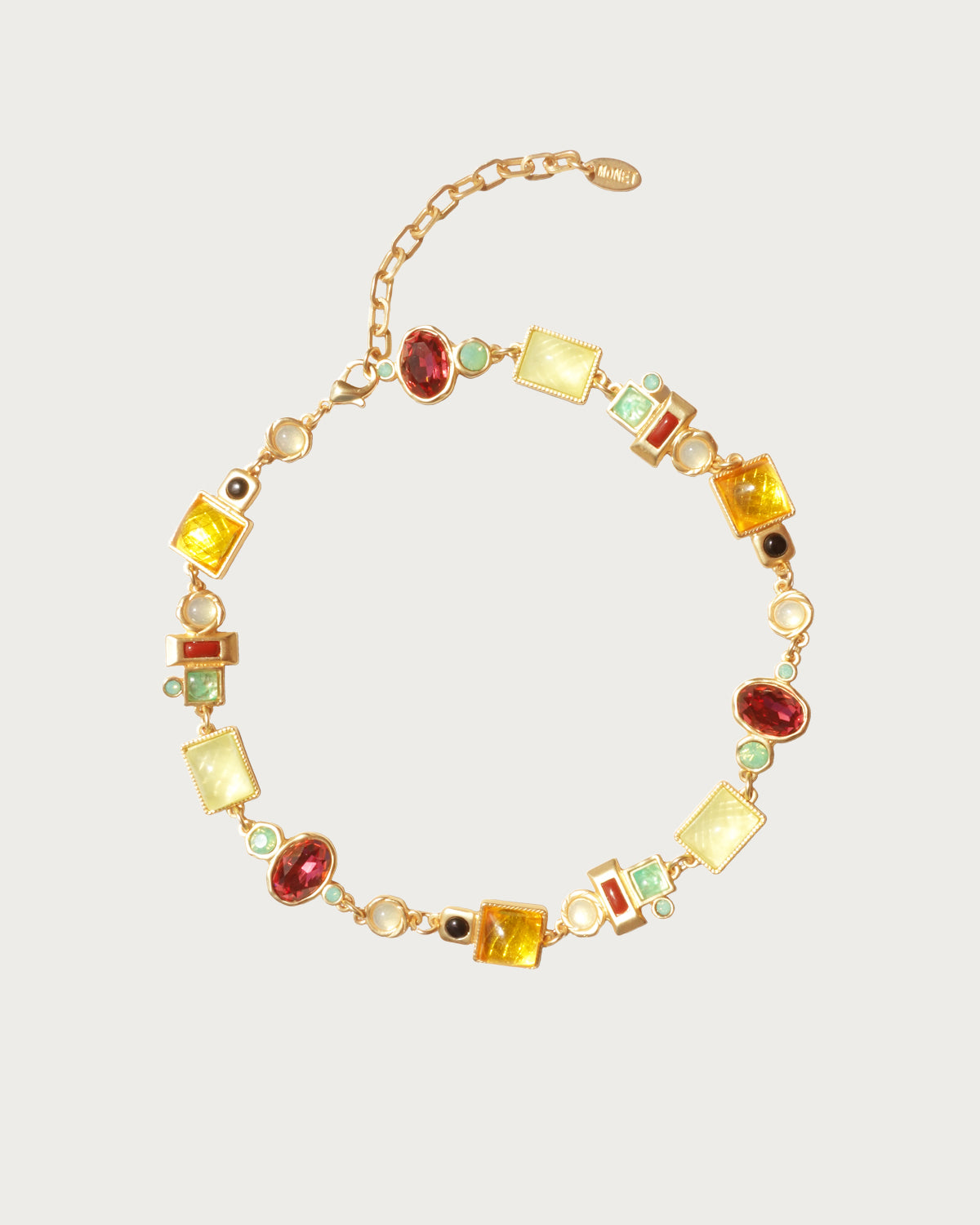 Embrace vintage charm with this retro-inspired jewelry piece. Featuring colorful geometric shapes and a soft matte golden finish, this versatile design doubles as a necklace or bracelet. A nostalgic nod to the 90s and early 2000s with a modern twist.