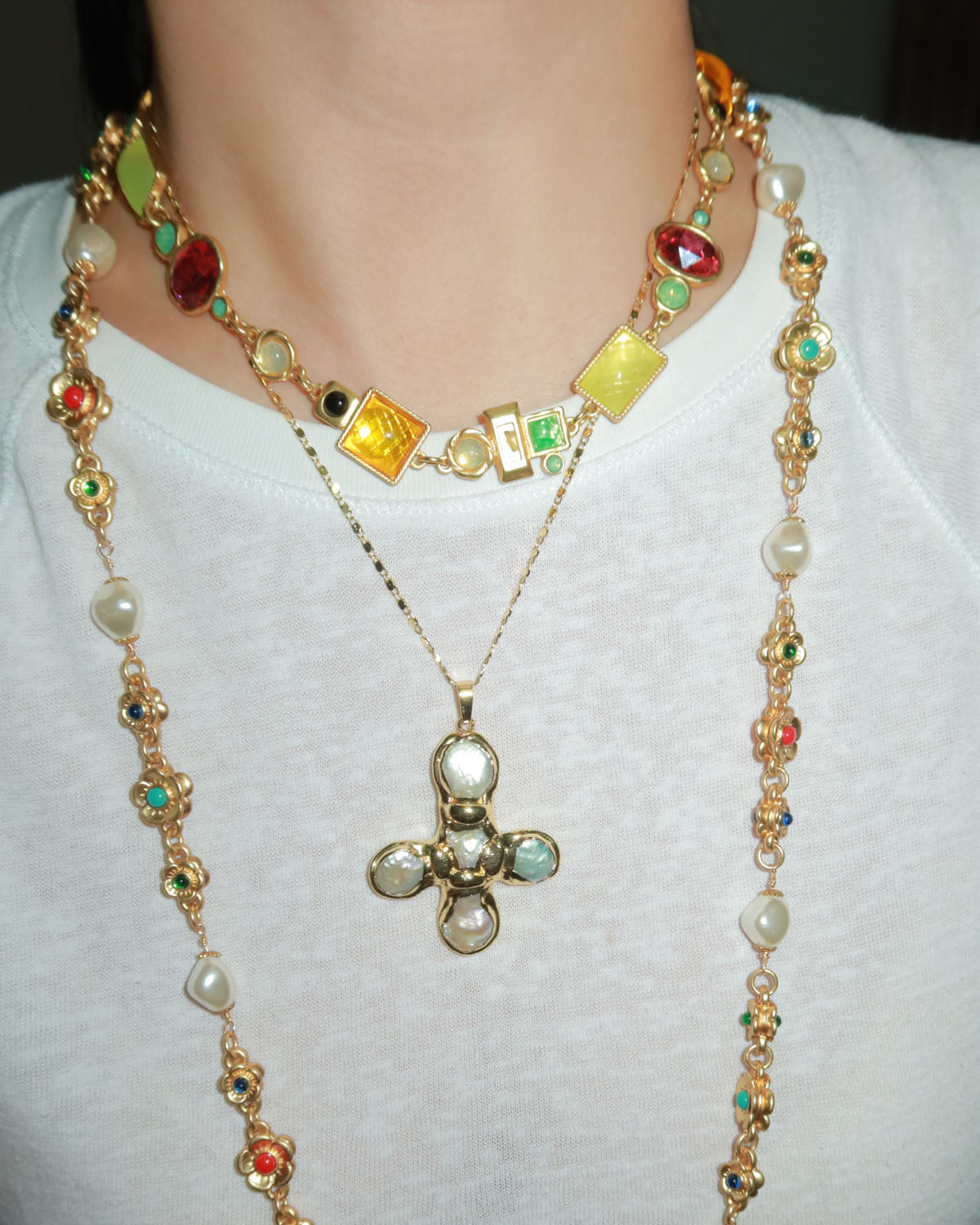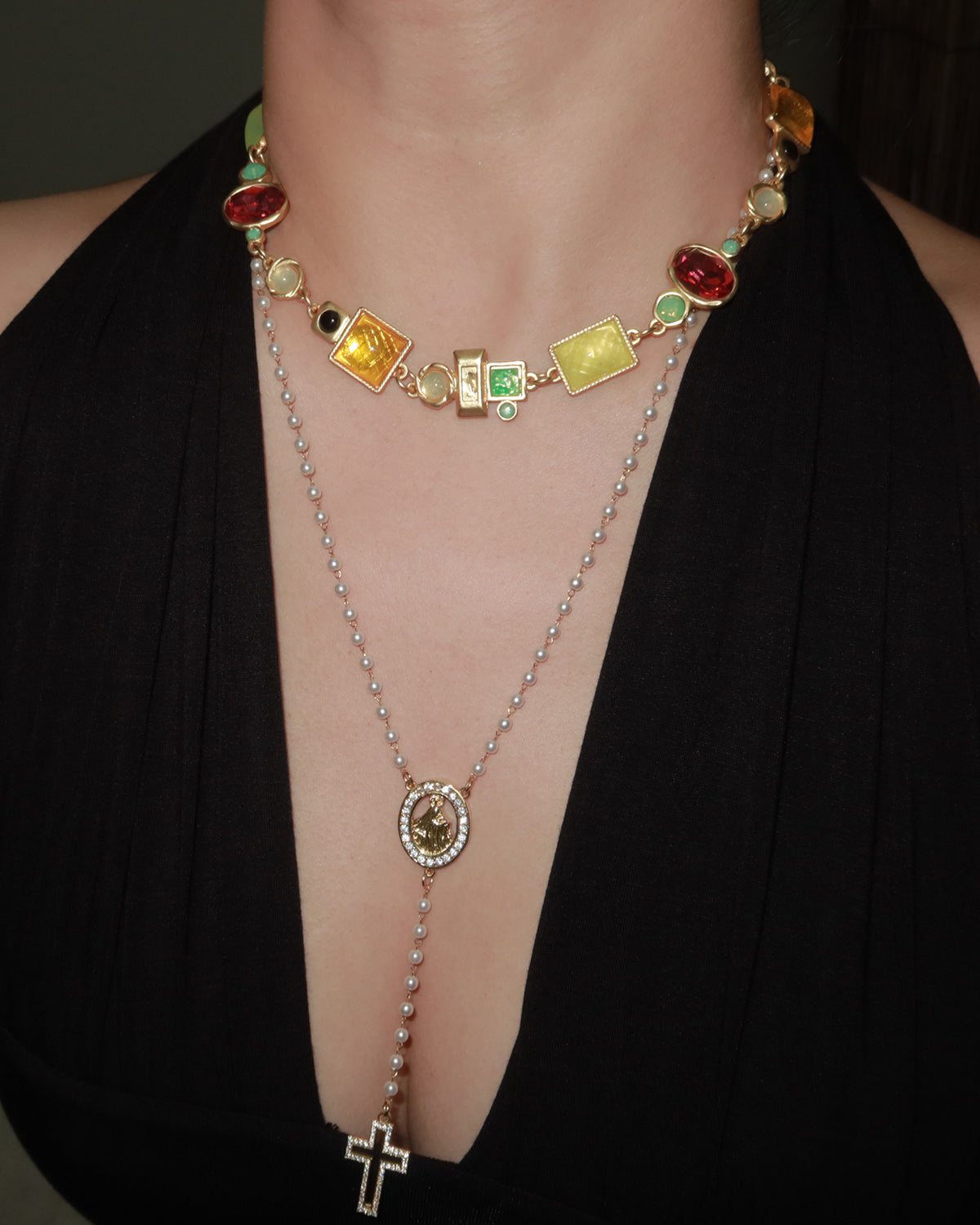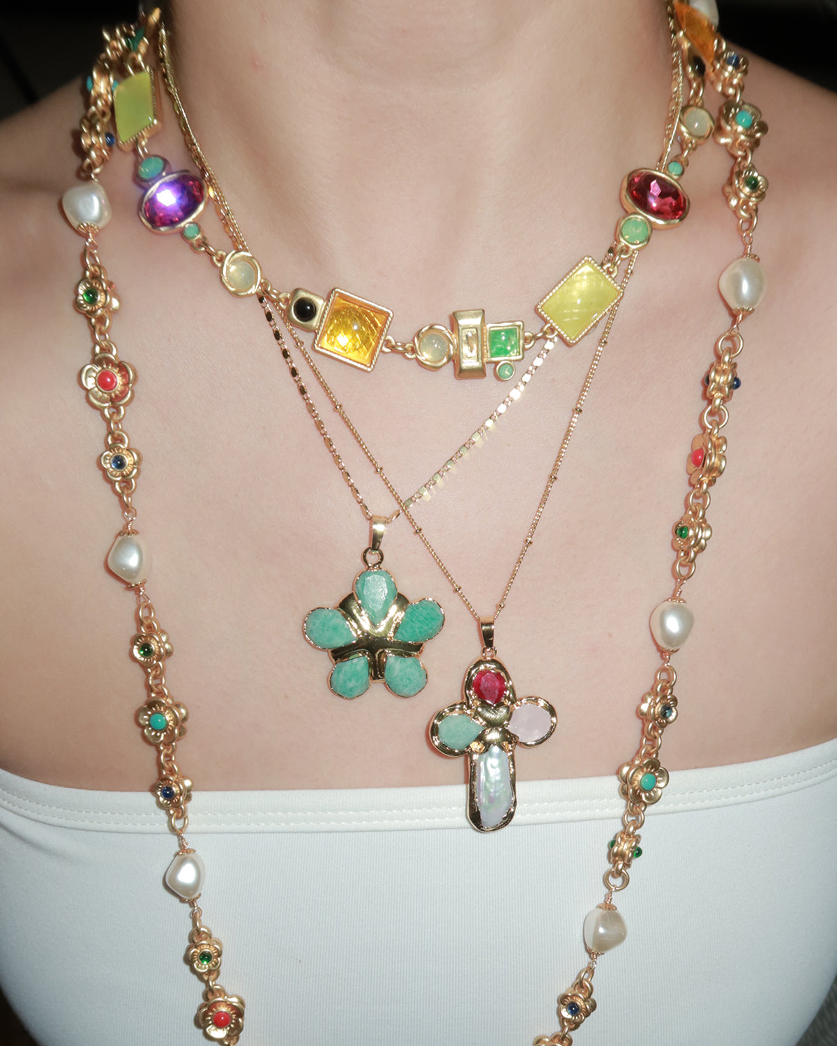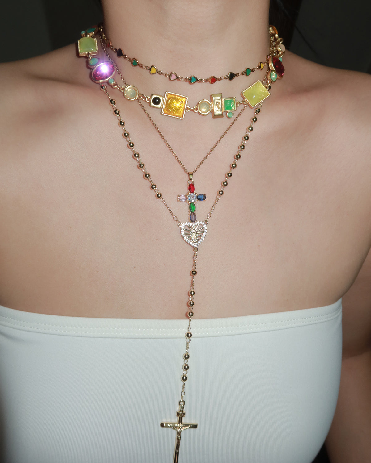 Embrace vintage charm with this retro-inspired jewelry piece. Featuring colorful geometric shapes and a soft matte golden finish, this versatile design doubles as a necklace or bracelet. A nostalgic nod to the 90s and early 2000s with a modern twist.