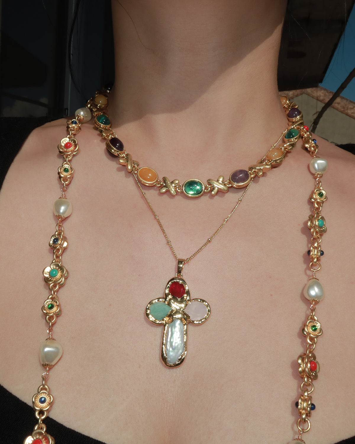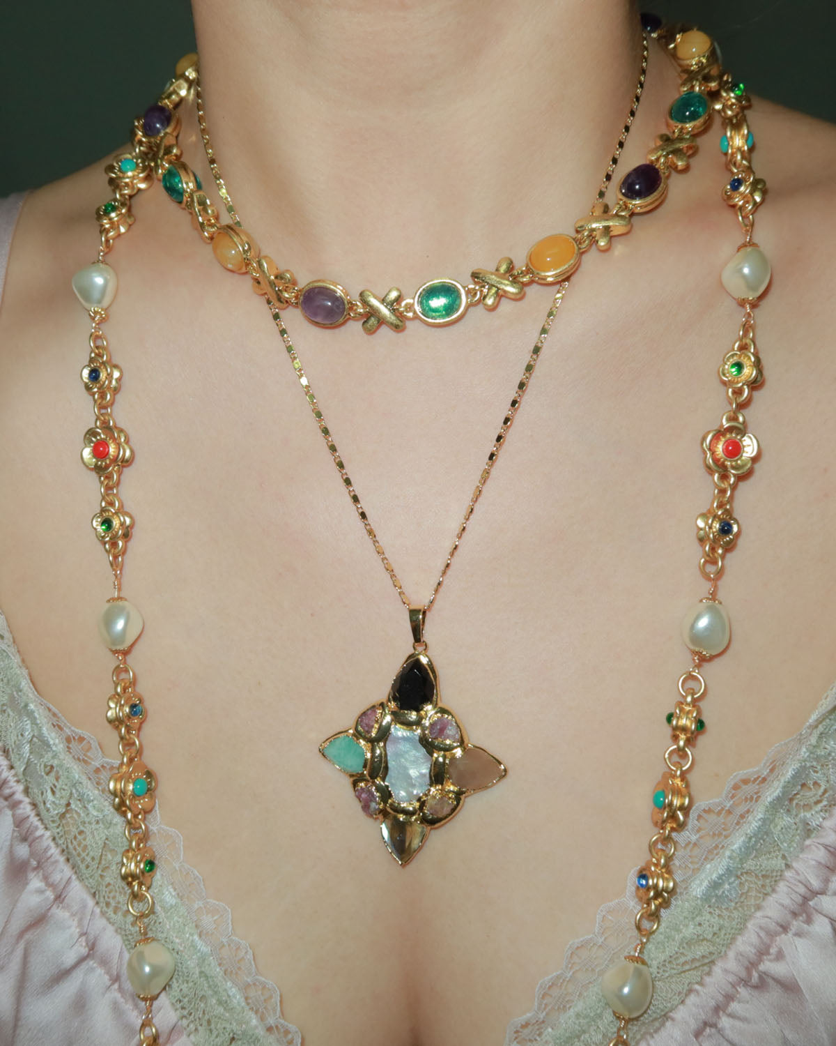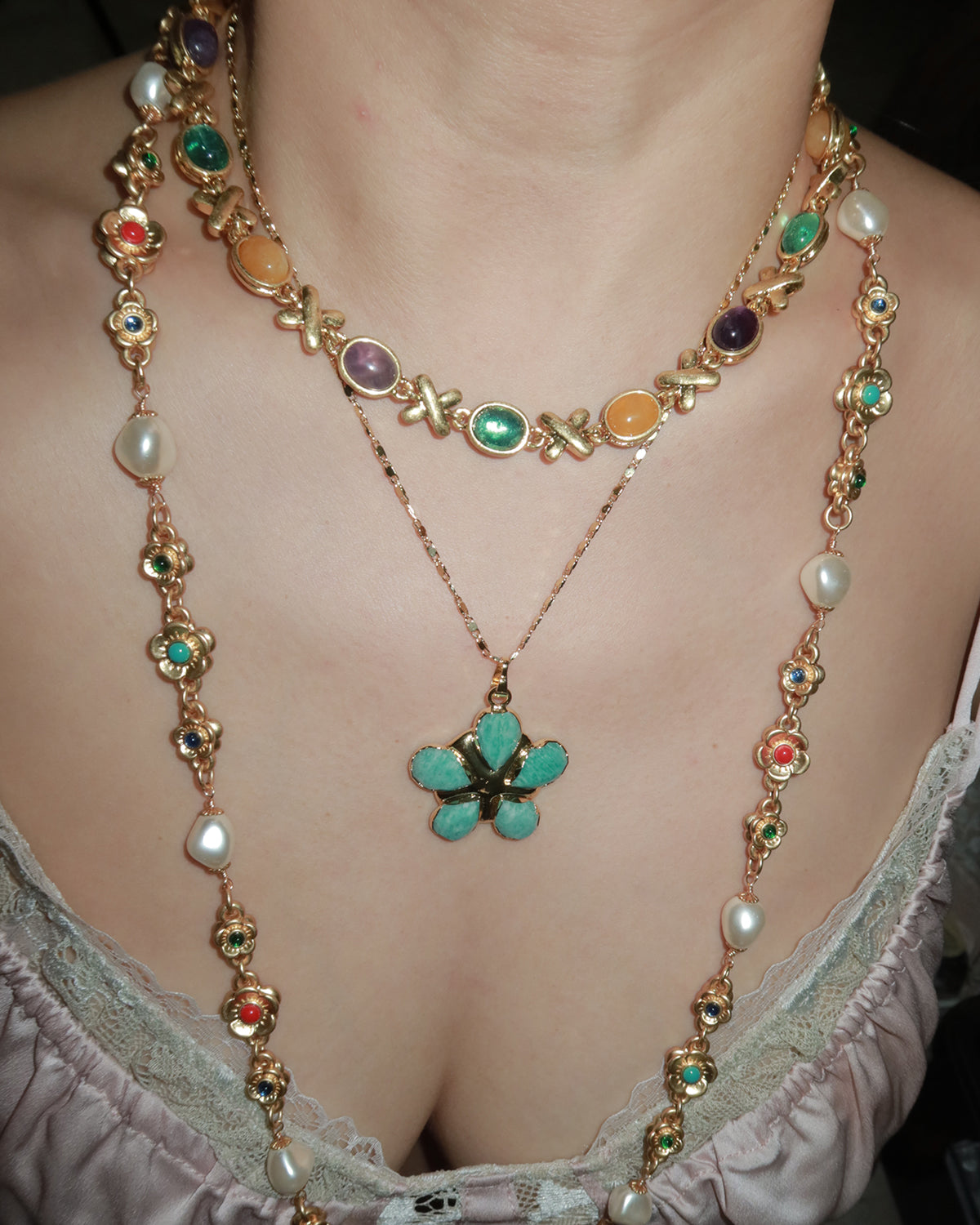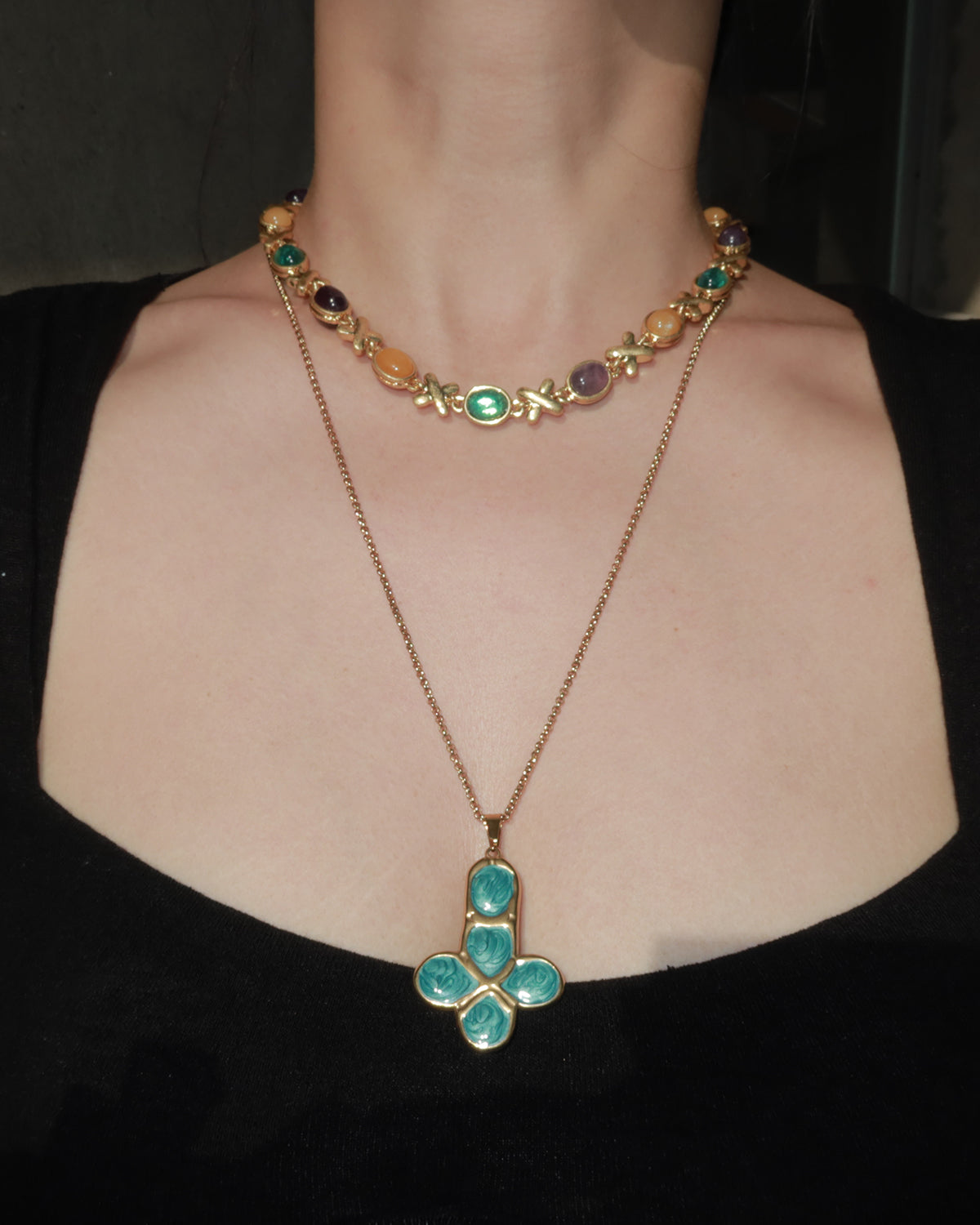 A true vintage treasure — this candy-colored glass pendant is a playful and artistic piece. With intricate detailing, it captures a retro artistic soul and vibrant energy. A bold yet elegant accent for any outfit.