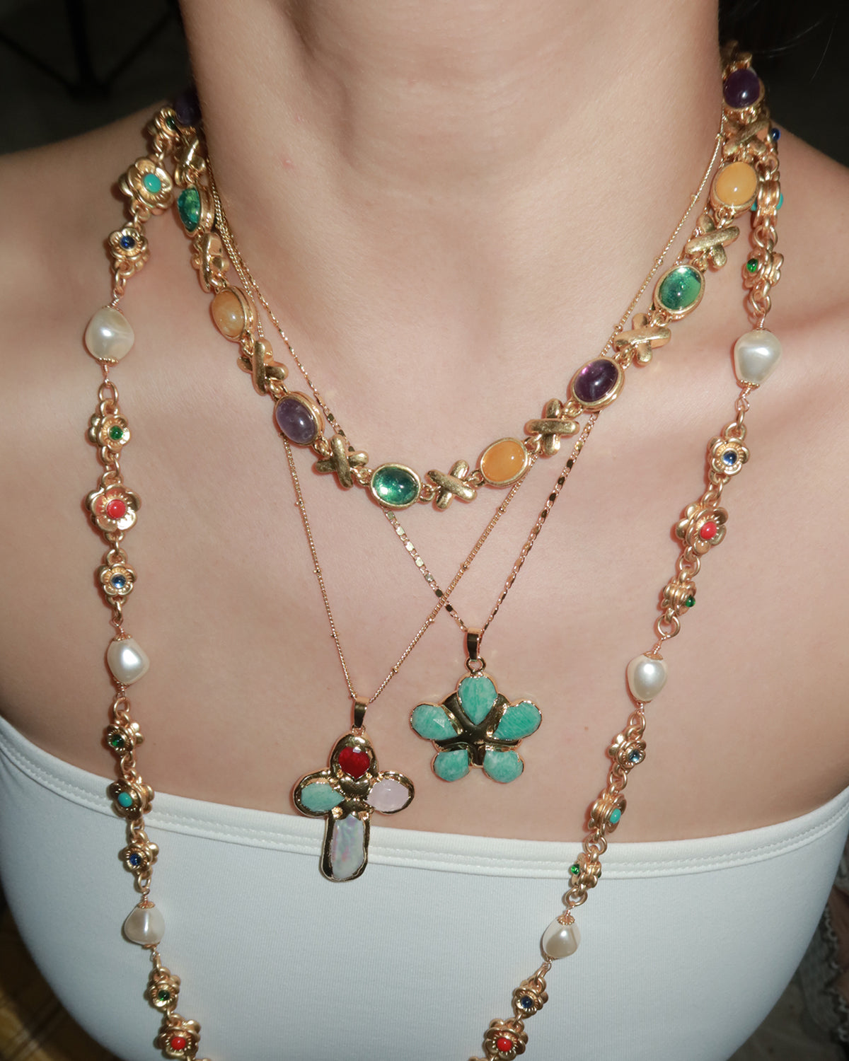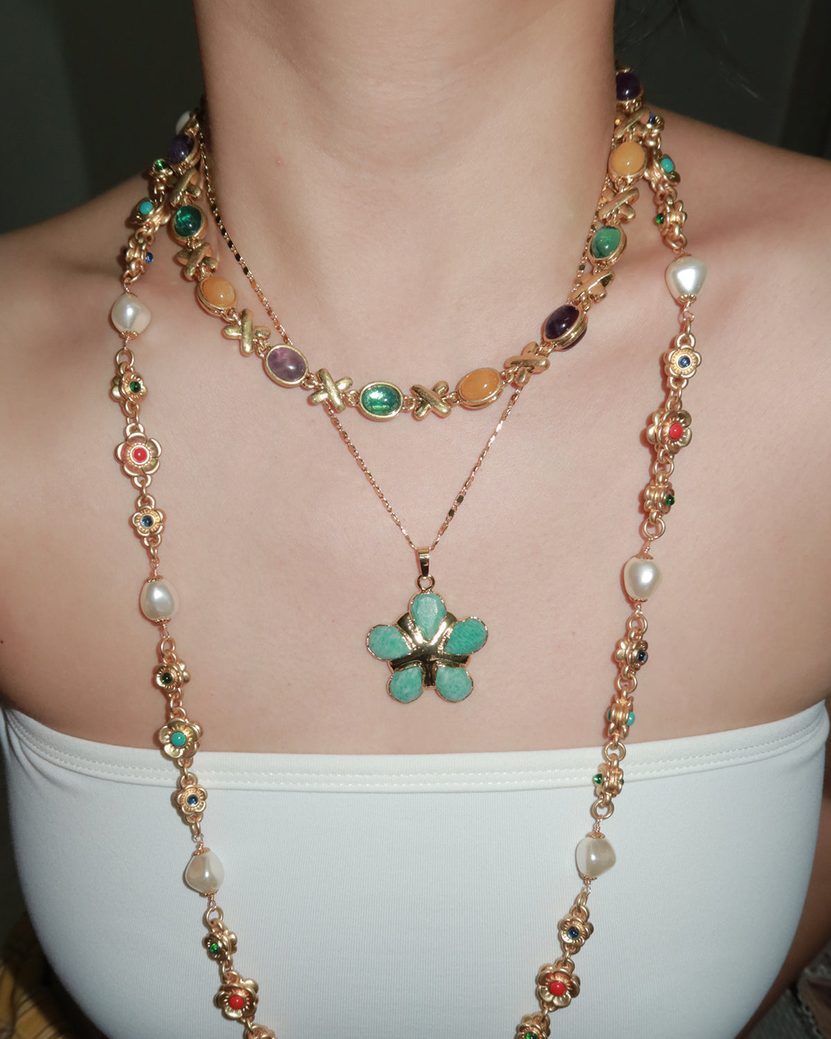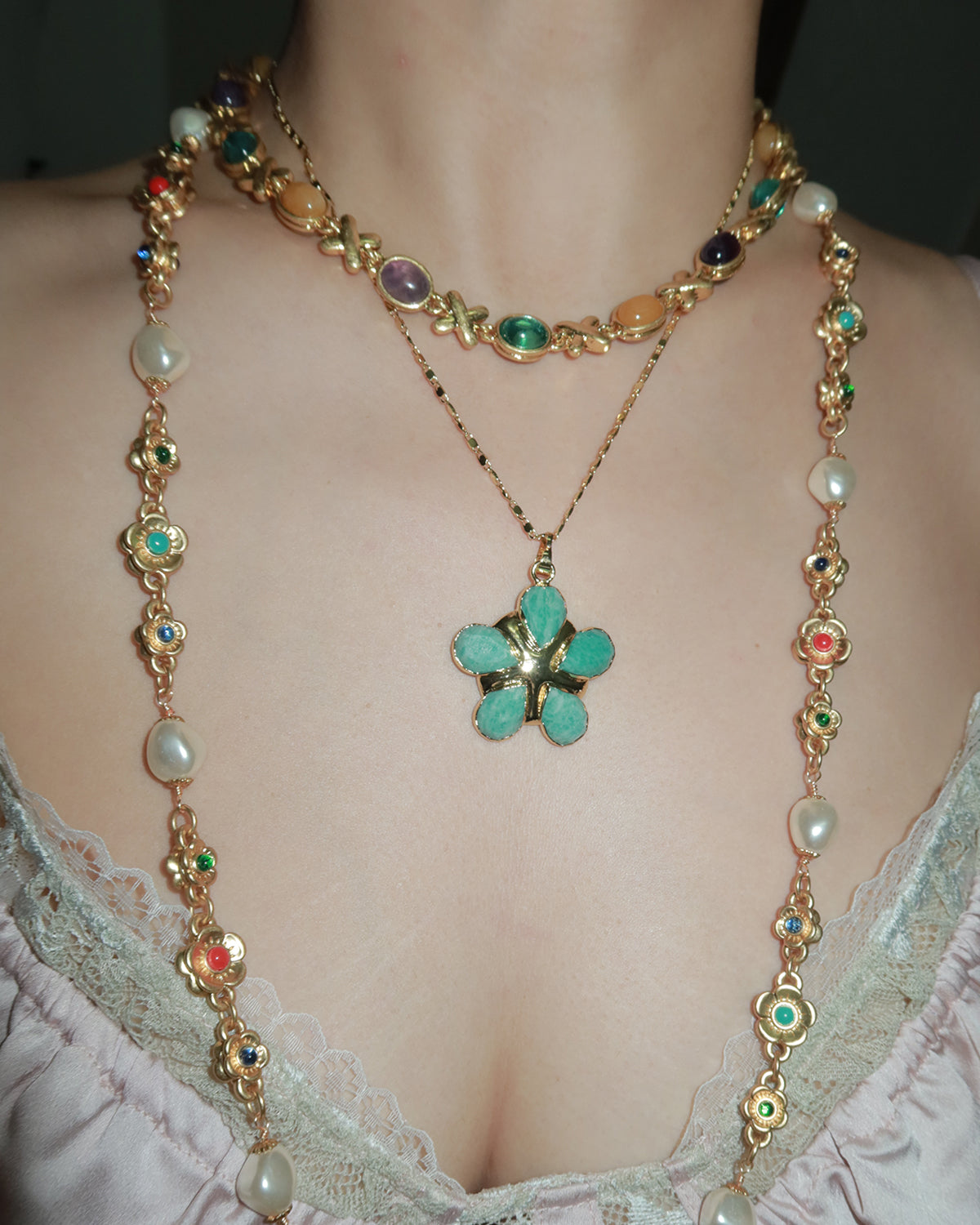 A true vintage treasure — this candy-colored glass pendant is a playful and artistic piece. With intricate detailing, it captures a retro artistic soul and vibrant energy. A bold yet elegant accent for any outfit.