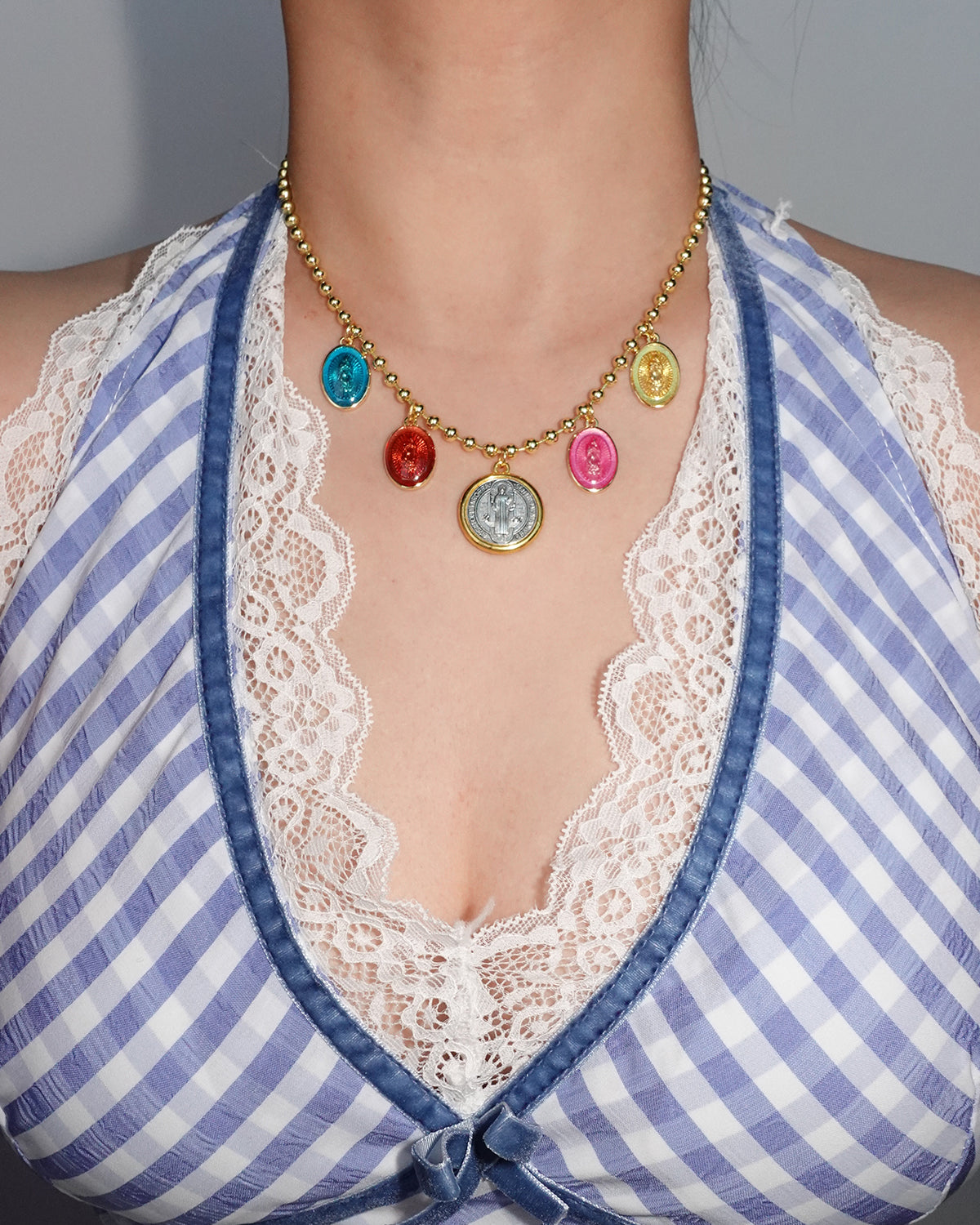 This necklace features a beautifully crafted Jesus pendant surrounded by colorful detailing, offering a timeless, personalized piece that symbolizes faith and adds a bright touch to your style.