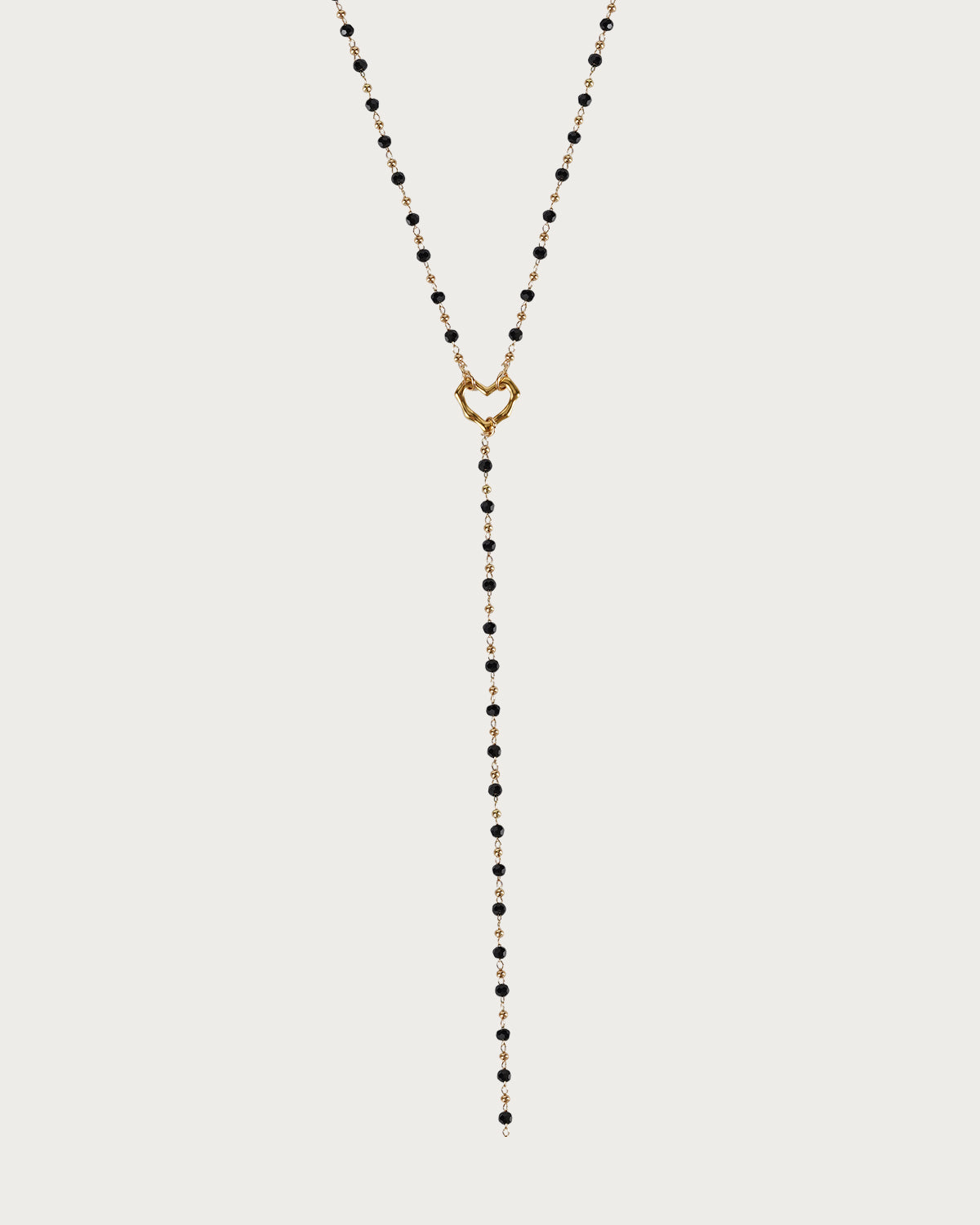 Lightweight and versatile, this Black Beaded Heart Gold Lariat Necklace enhances any outfit with its unique and graceful design.