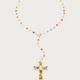 Vibrant and eye-catching, this necklace features a cross pendant adorned with multicolored rhinestones and beaded detailing. A bold expression of individuality and glamour.