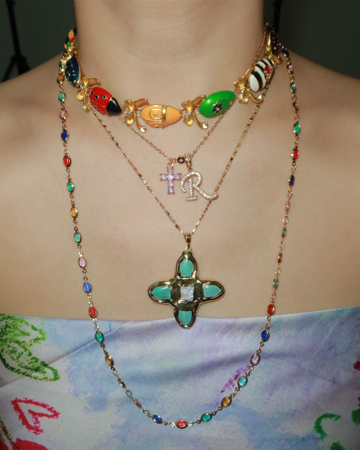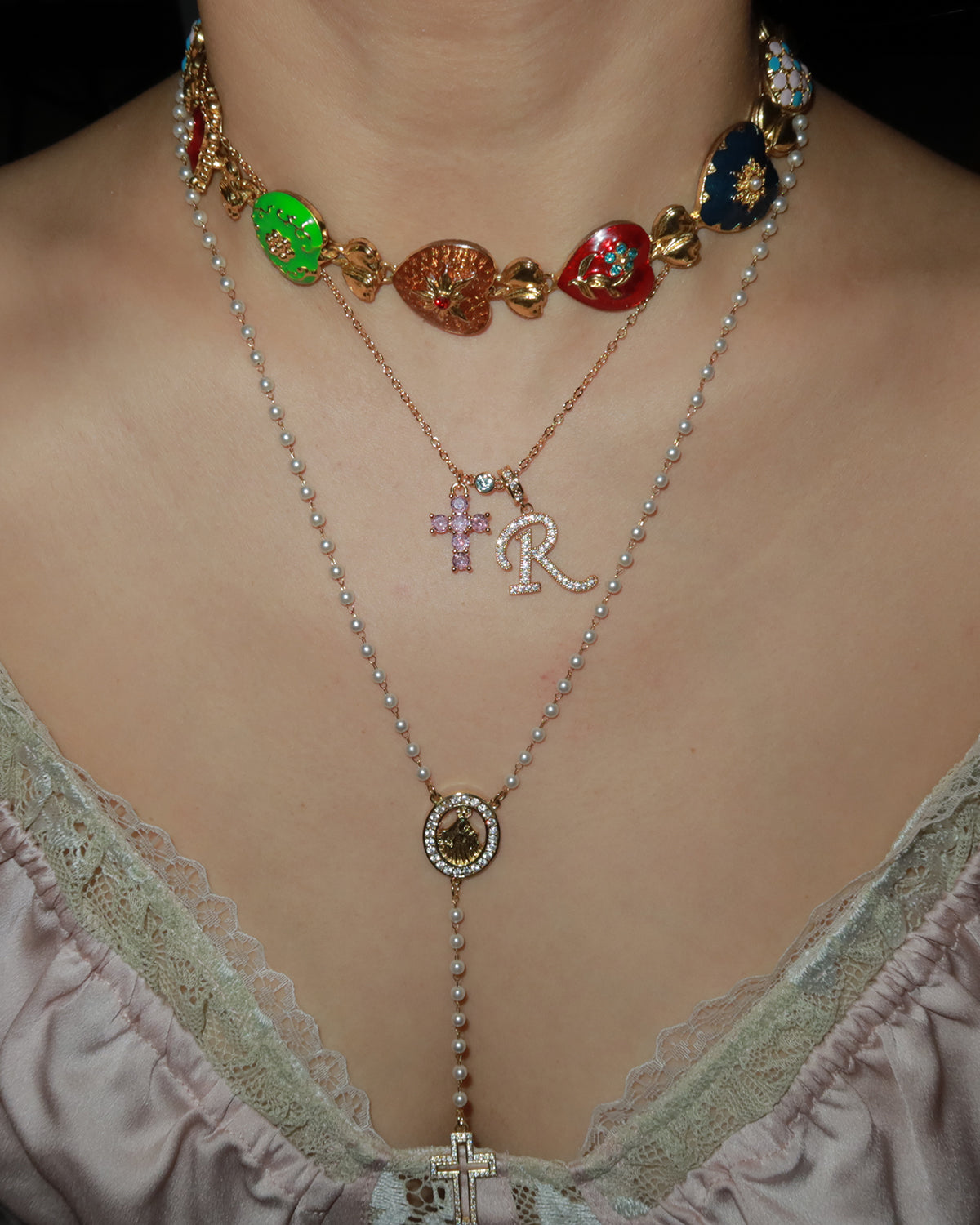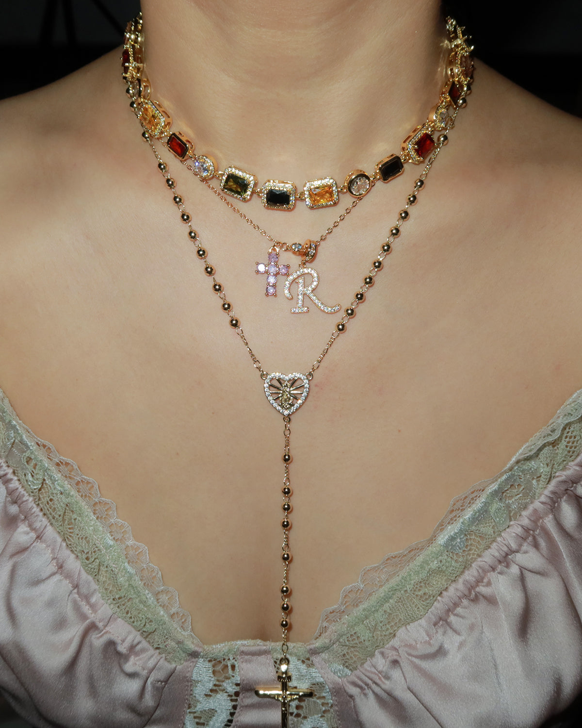 A charming necklace featuring a glittering pink rhinestone cross paired with an elegant “R” initial. Designed in a sweet and minimal style, it’s perfect for layering or wearing solo as a personal statement. A lovely gift for yourself or someone special.