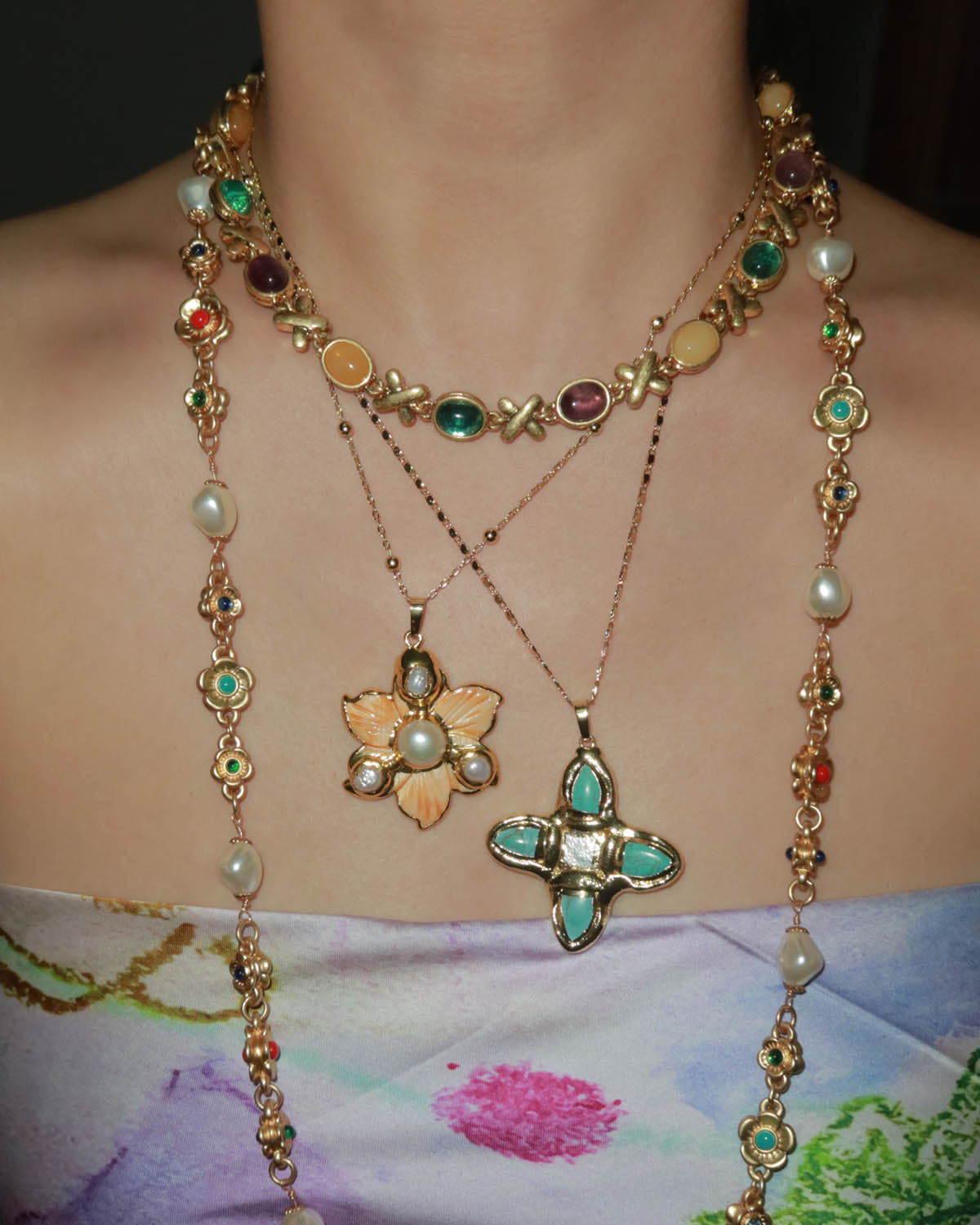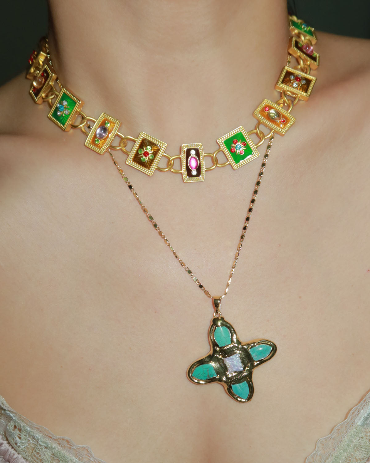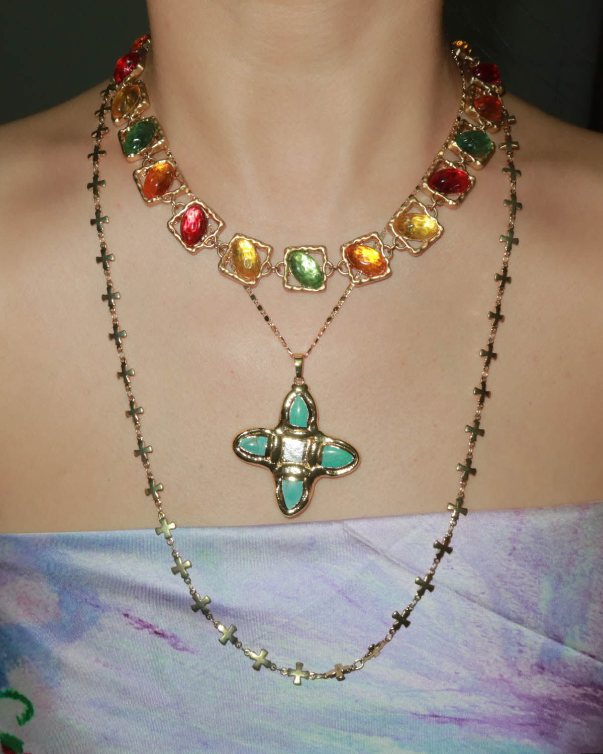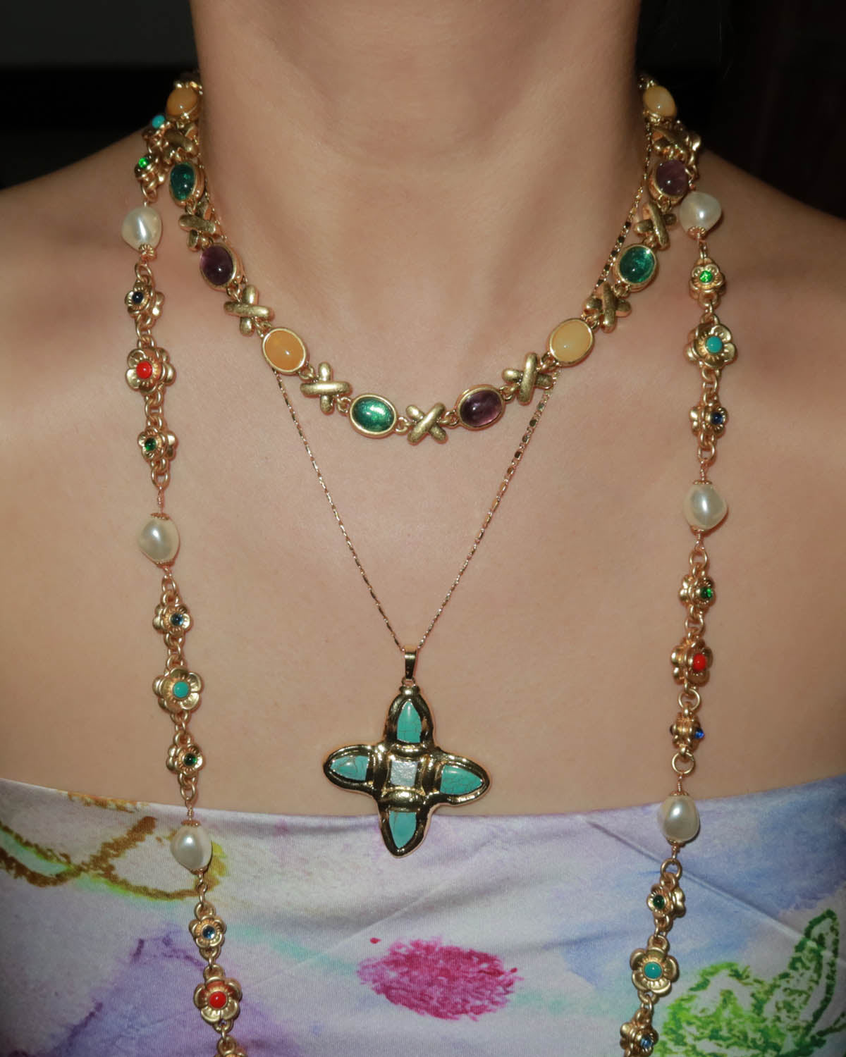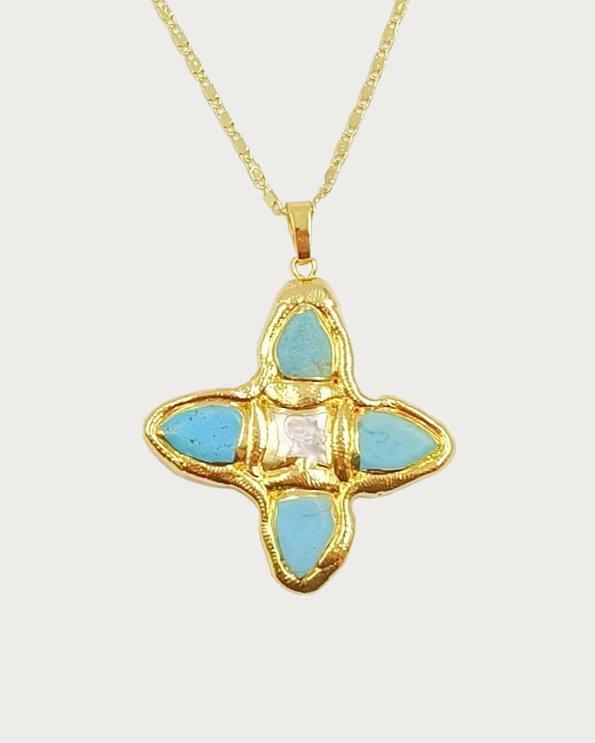 This cross pendant features a unique blend of natural turquoise and freshwater pearls — a bold yet graceful statement piece that channels boho and vintage vibes effortlessly. Both sides are the same, so you can wear it as you like.