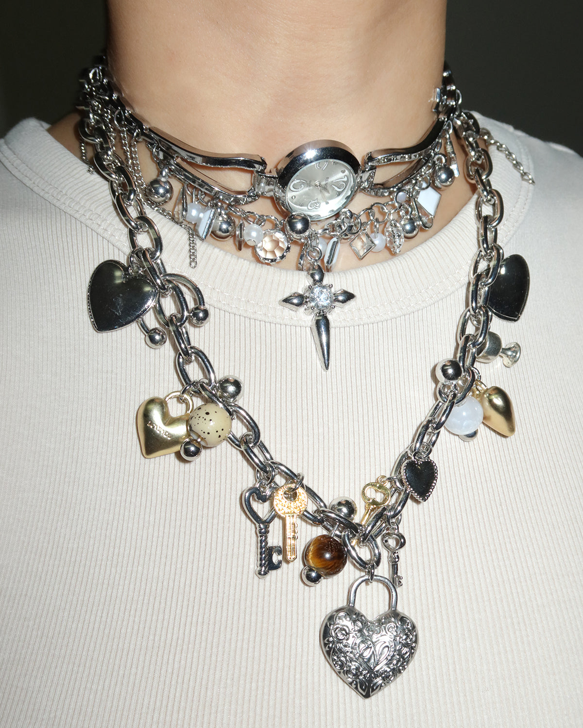 A fusion of vintage charm and celestial energy — this necklace features a cross, clock, and star pendants with delicate tassel details. Perfect for Y2K-inspired or gothic-chic styles.