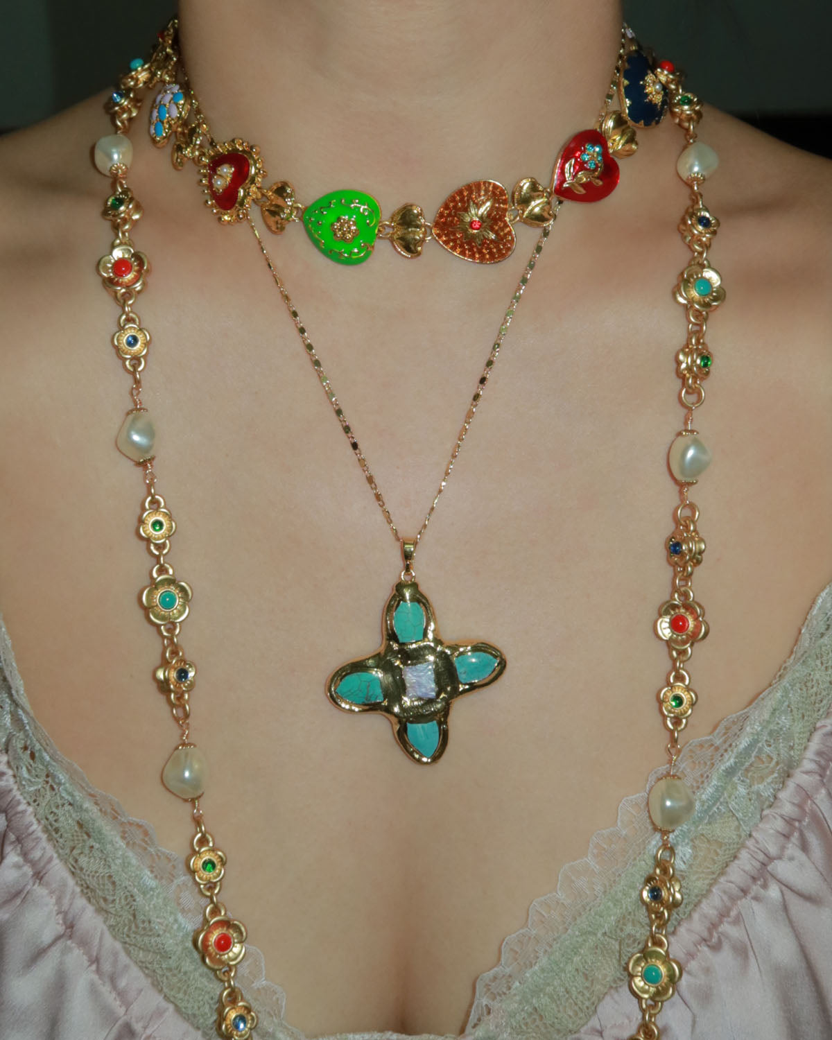 The beautifully crafted enamel coating adds a touch of color and depth, enhancing the necklace’s vintage appeal.