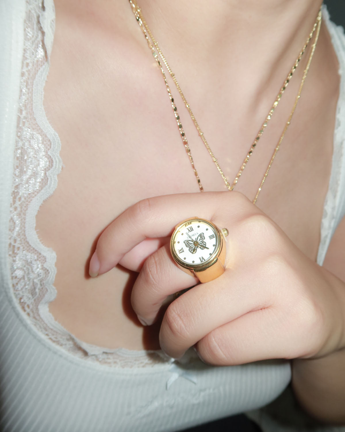 The Butterfly Watch Golden Ring features a delicate butterfly motif paired with a tiny watch face, blending charm and functionality in one unique piece.