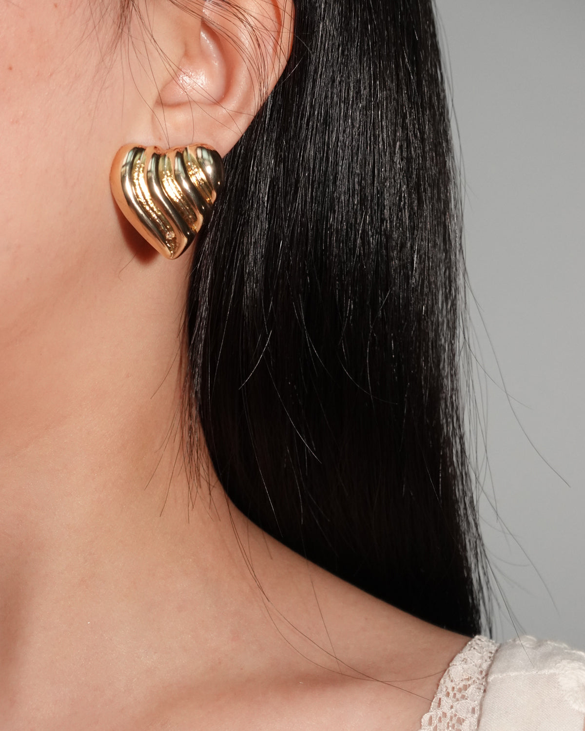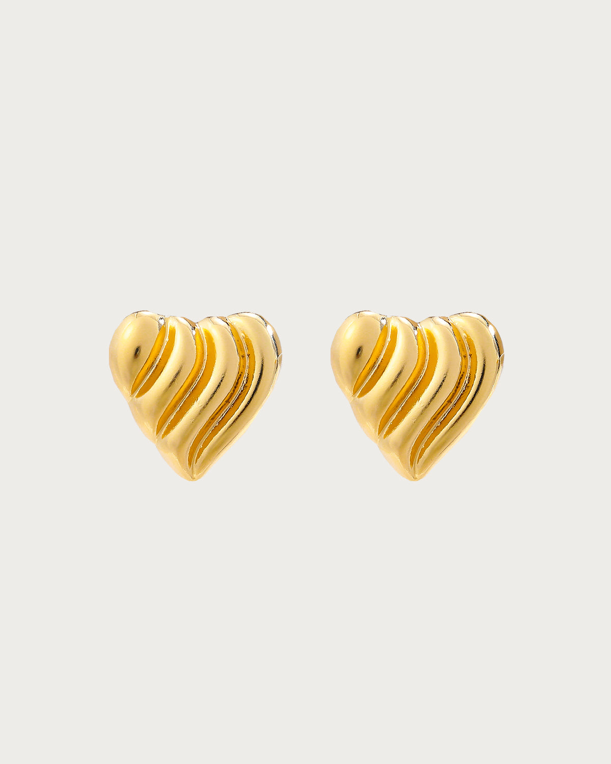 The Ribbed Puffy Heart Golden Stud Earrings feature a romantic heart shape with delicate ribbed detailing, adding texture and depth.