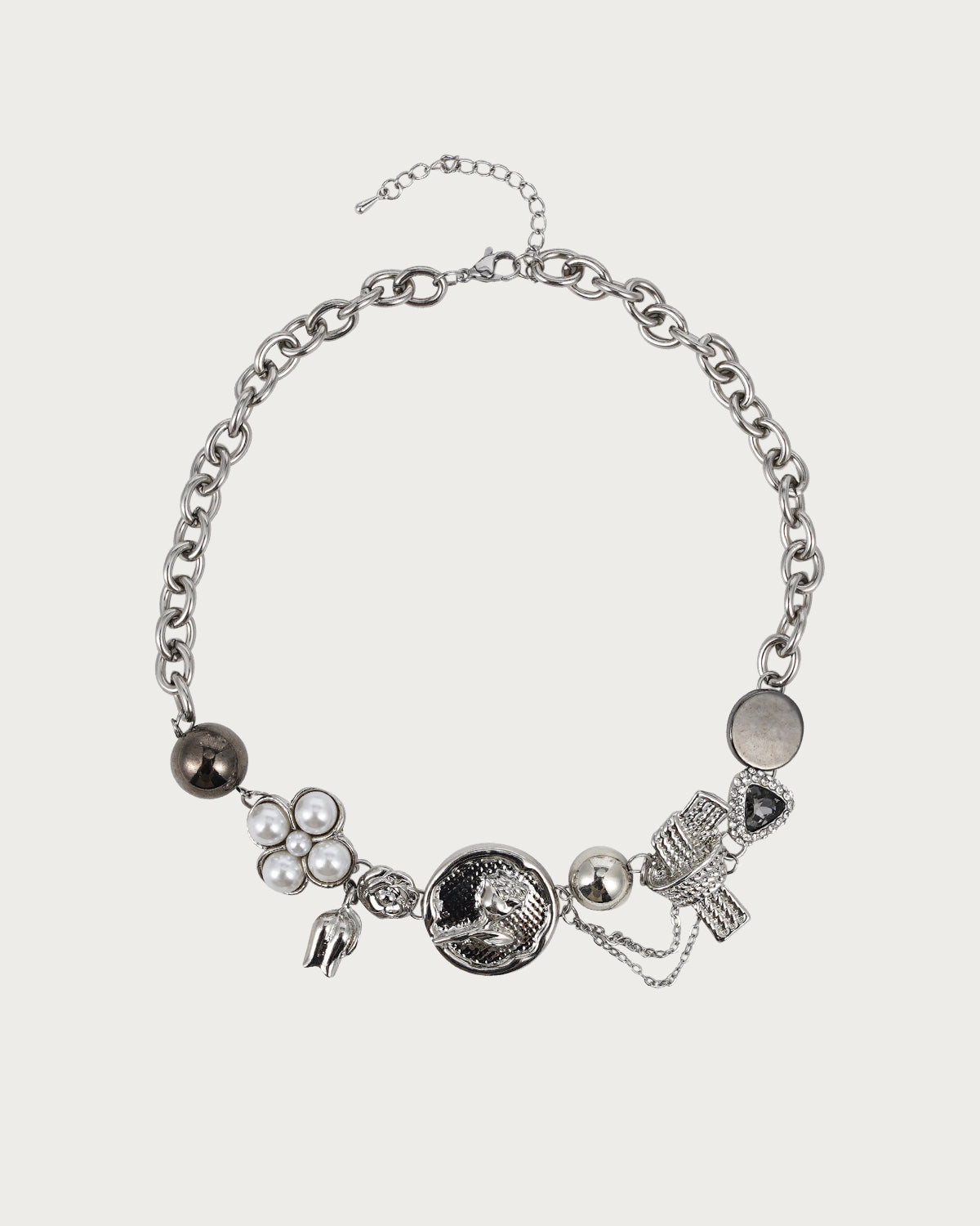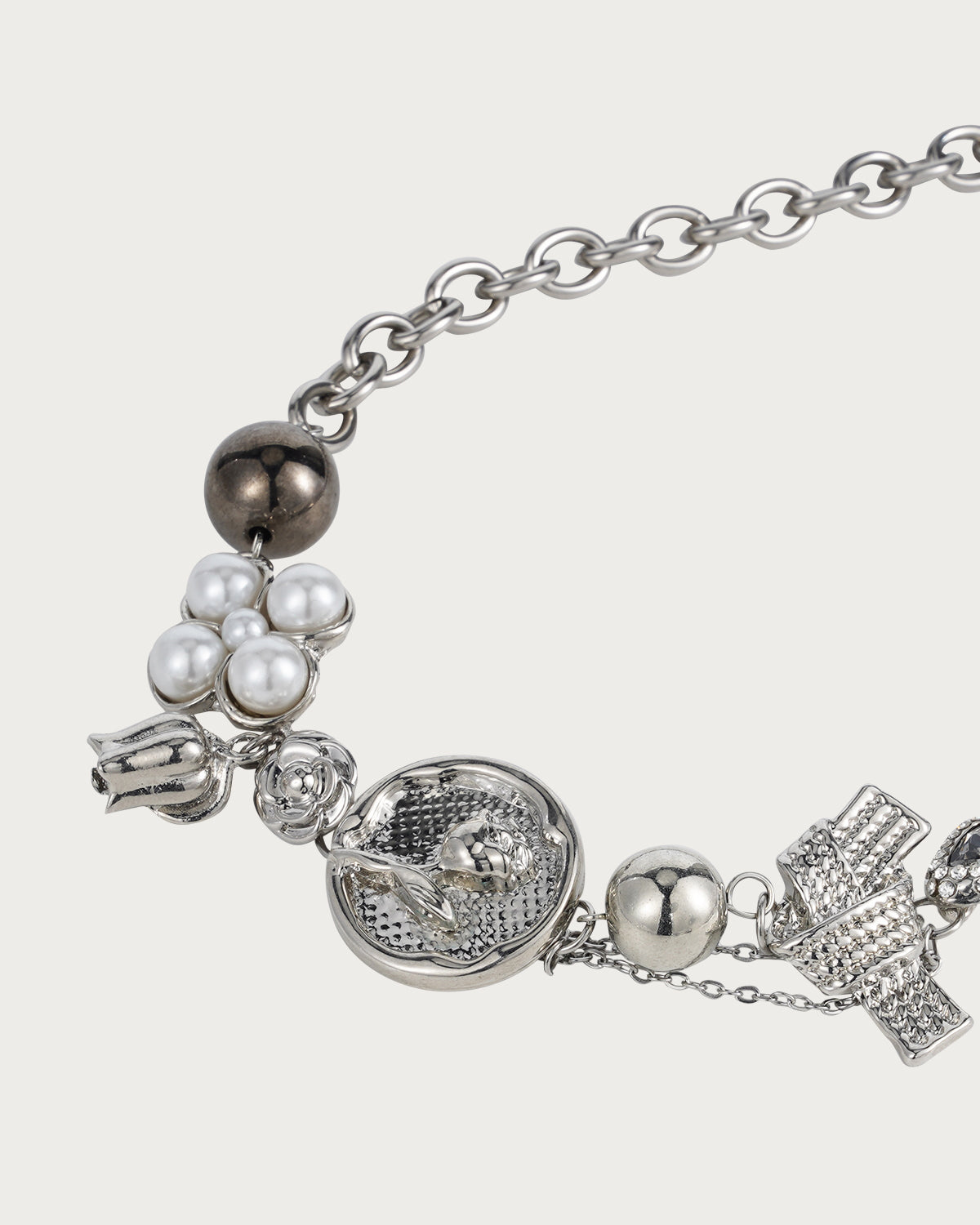 Beautiful silver choker adorned with a rose and pearl, perfect for a chic, feminine look.