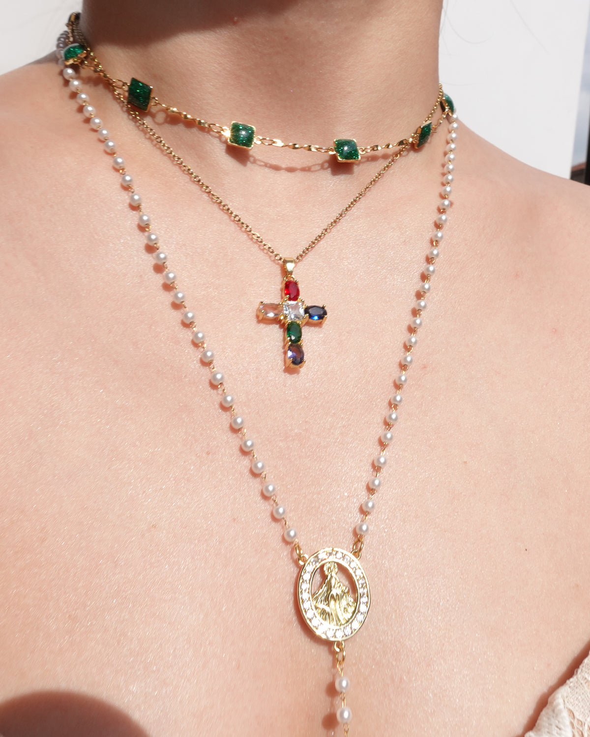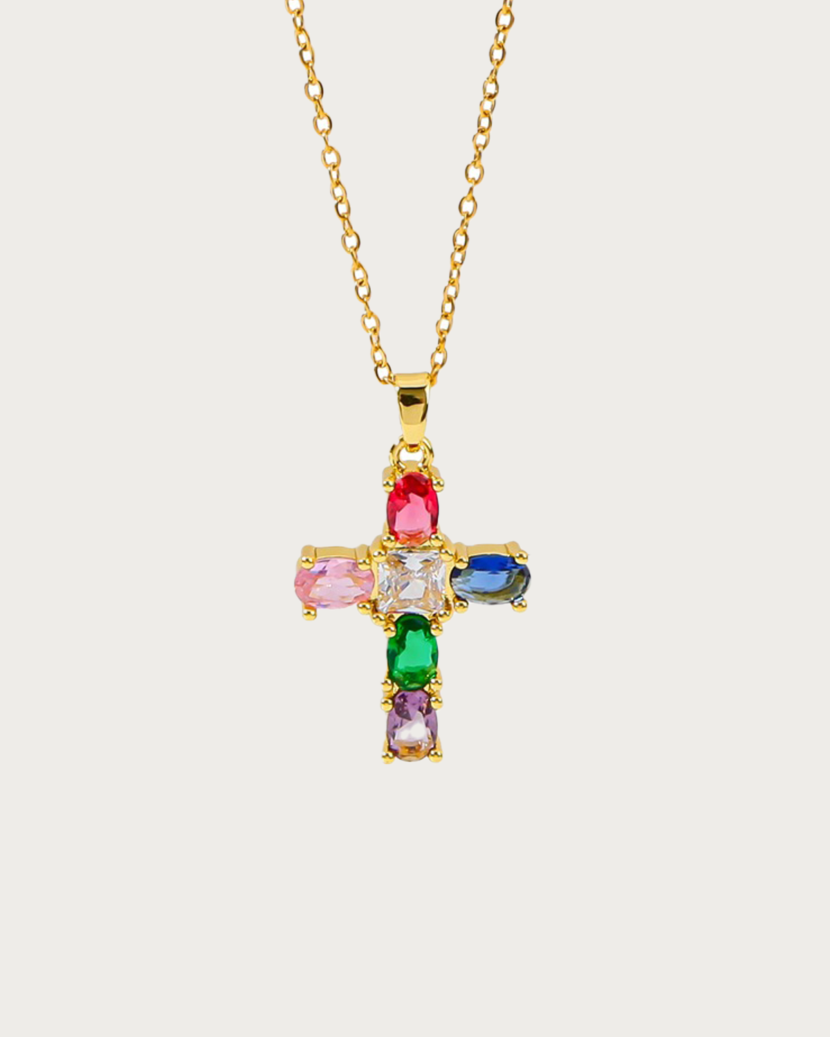 This colorful stone cross golden pendant necklace blends elegance with vibrant charm, perfect for any occasion.