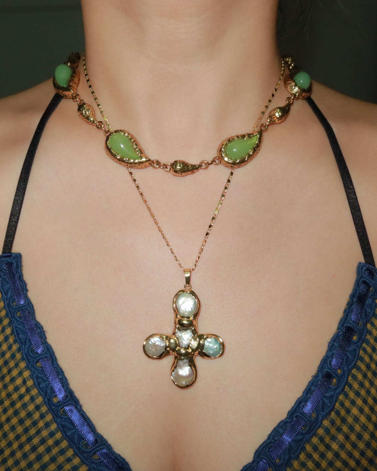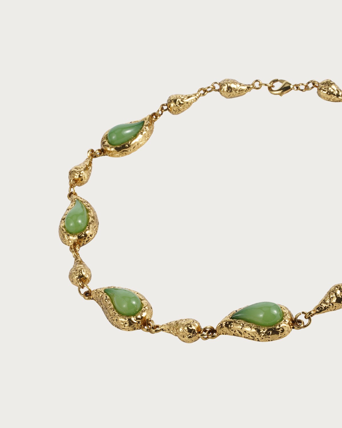 The Vintage Resin Green Golden Necklace blends rich green resin with a golden frame, creating a unique, vintage-inspired accessory that expresses individuality and timeless style.