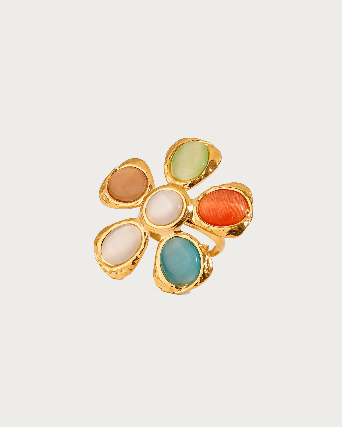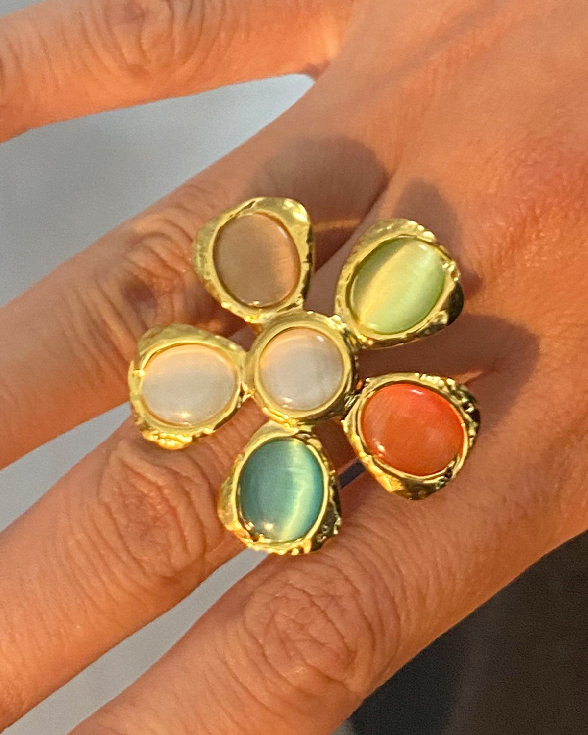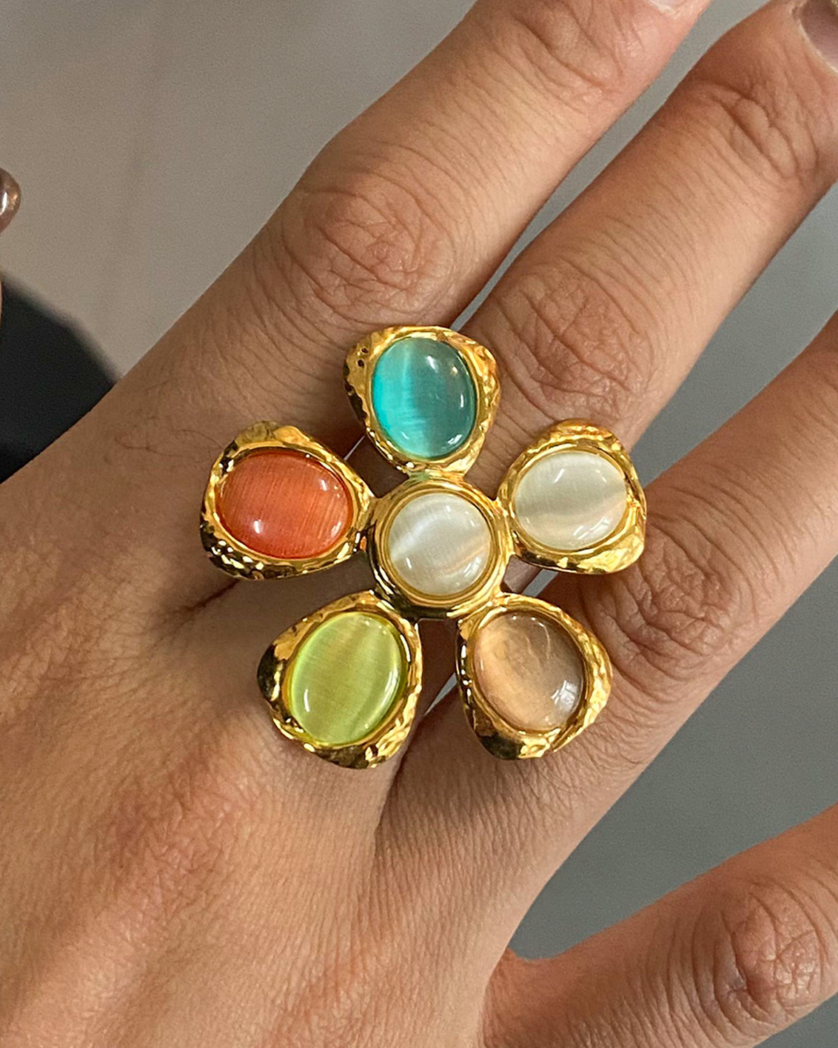 The Rainbow Flower Golden Ring features a colorful floral design, adding a joyful and lively touch to your jewelry collection.