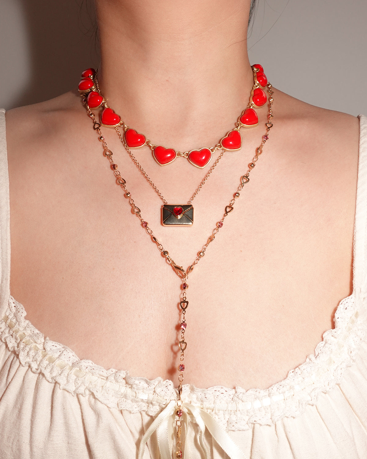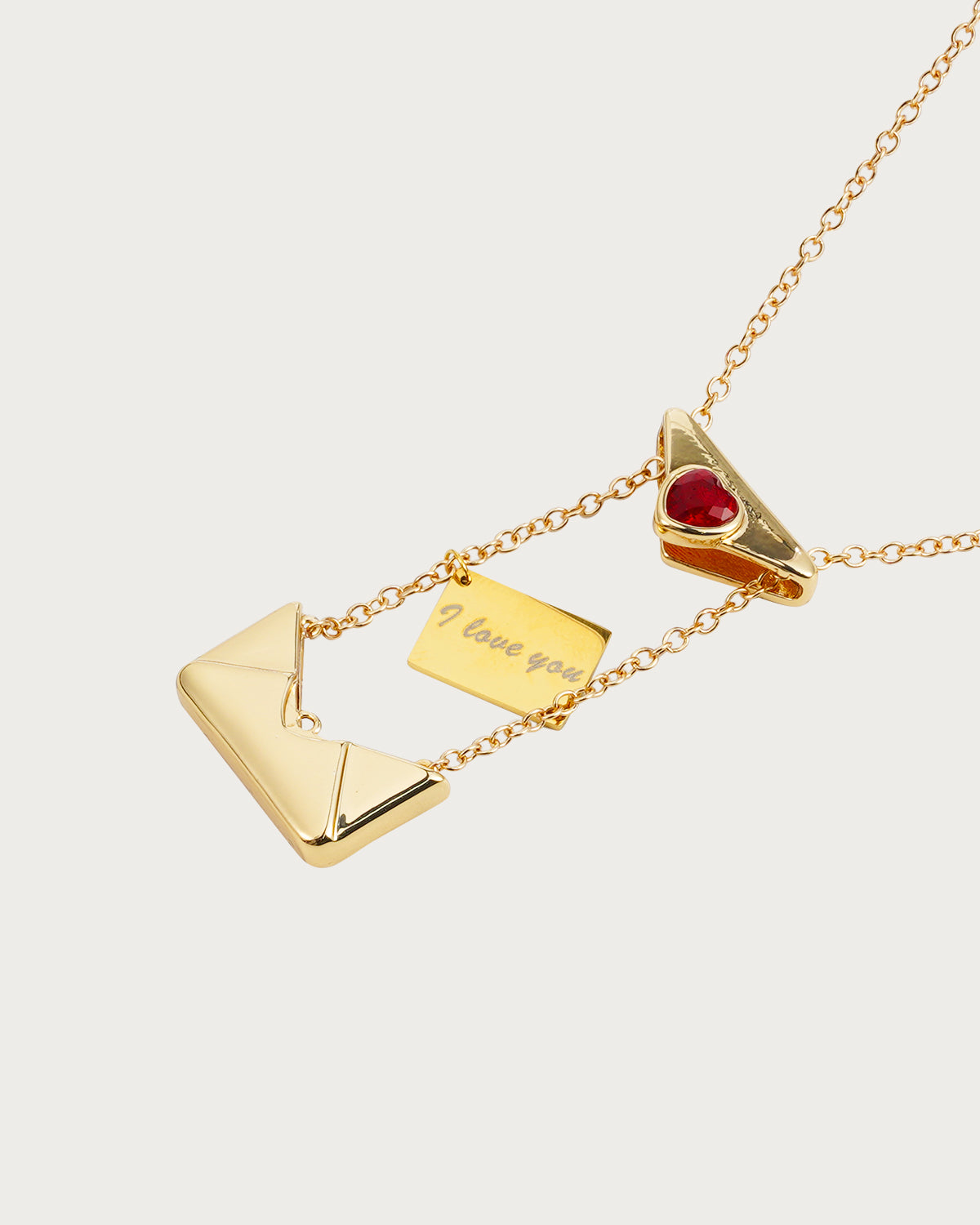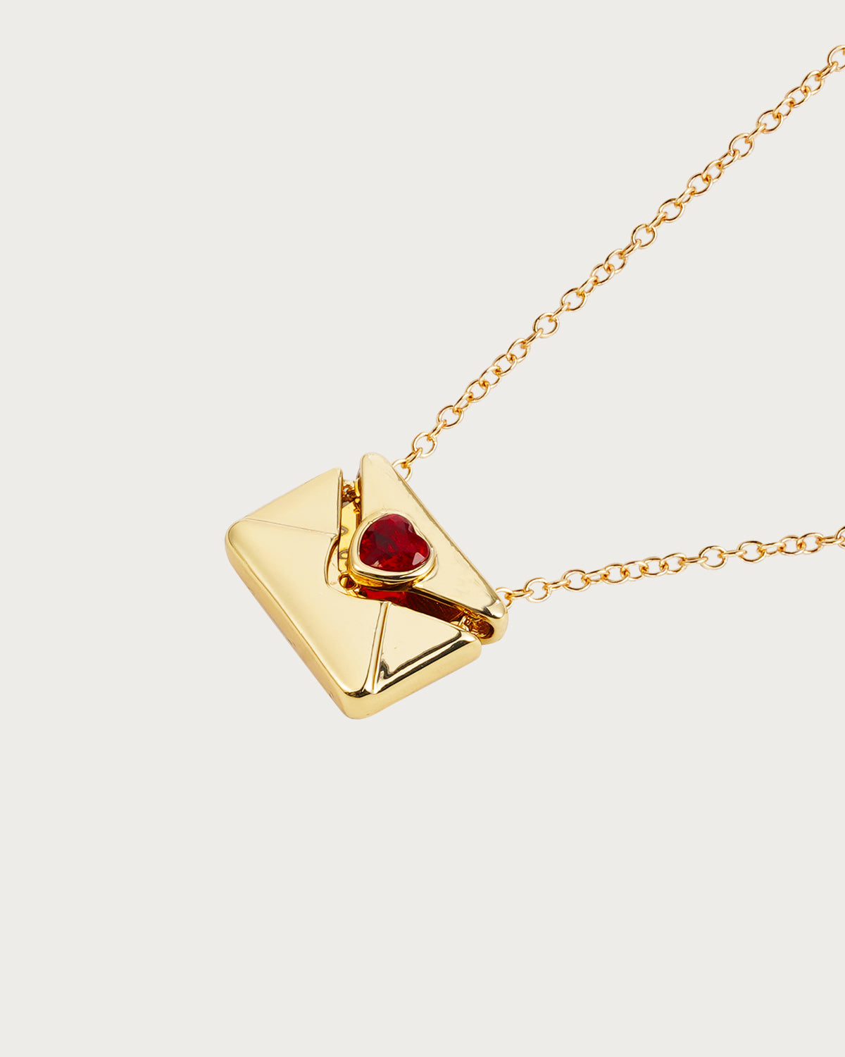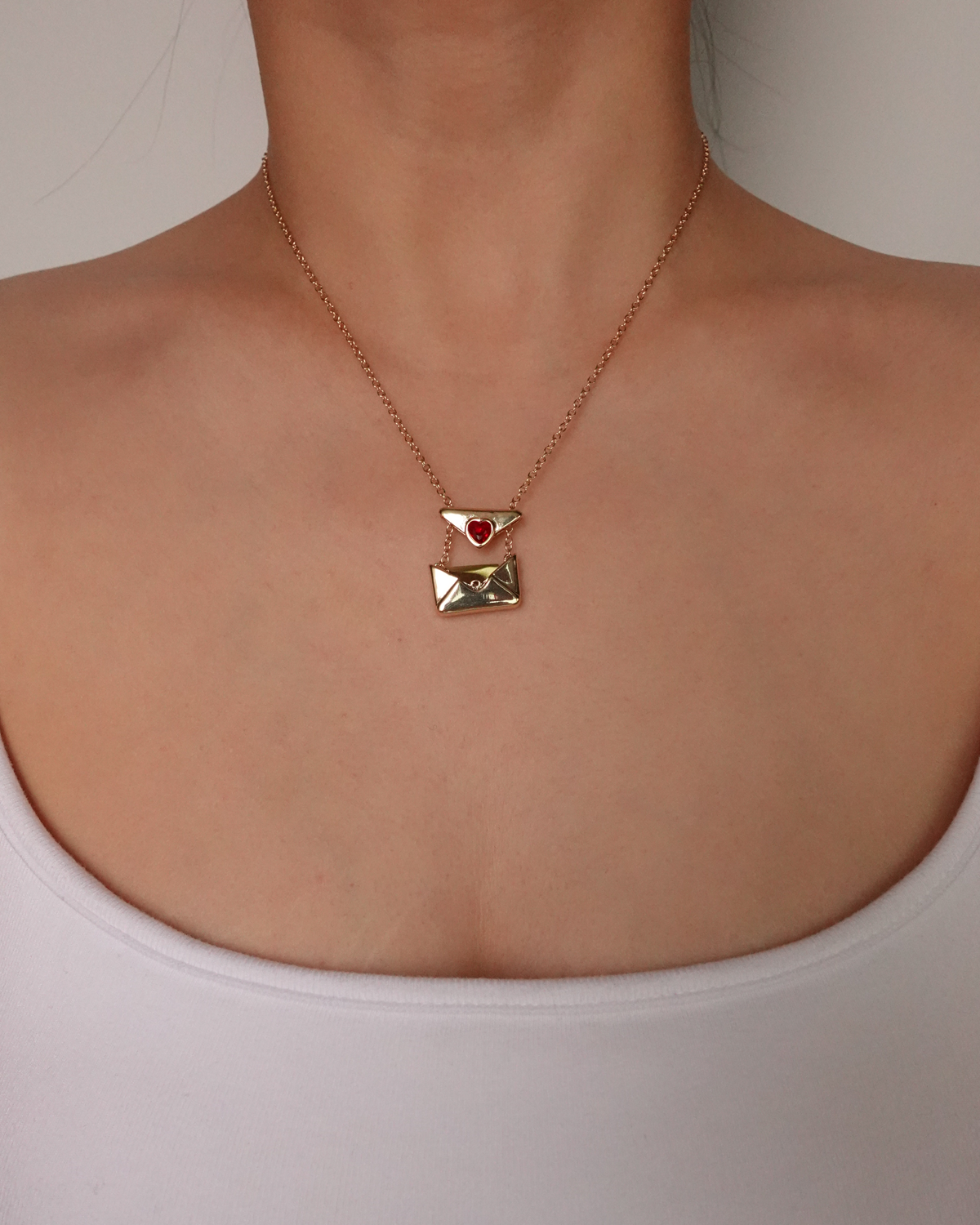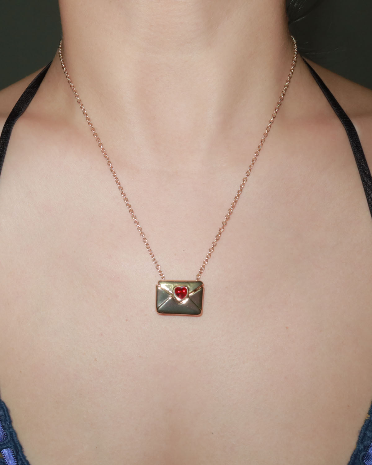 The letter heart red golden pendant necklace features a heart-shaped envelope charm, perfect for a sentimental touch.