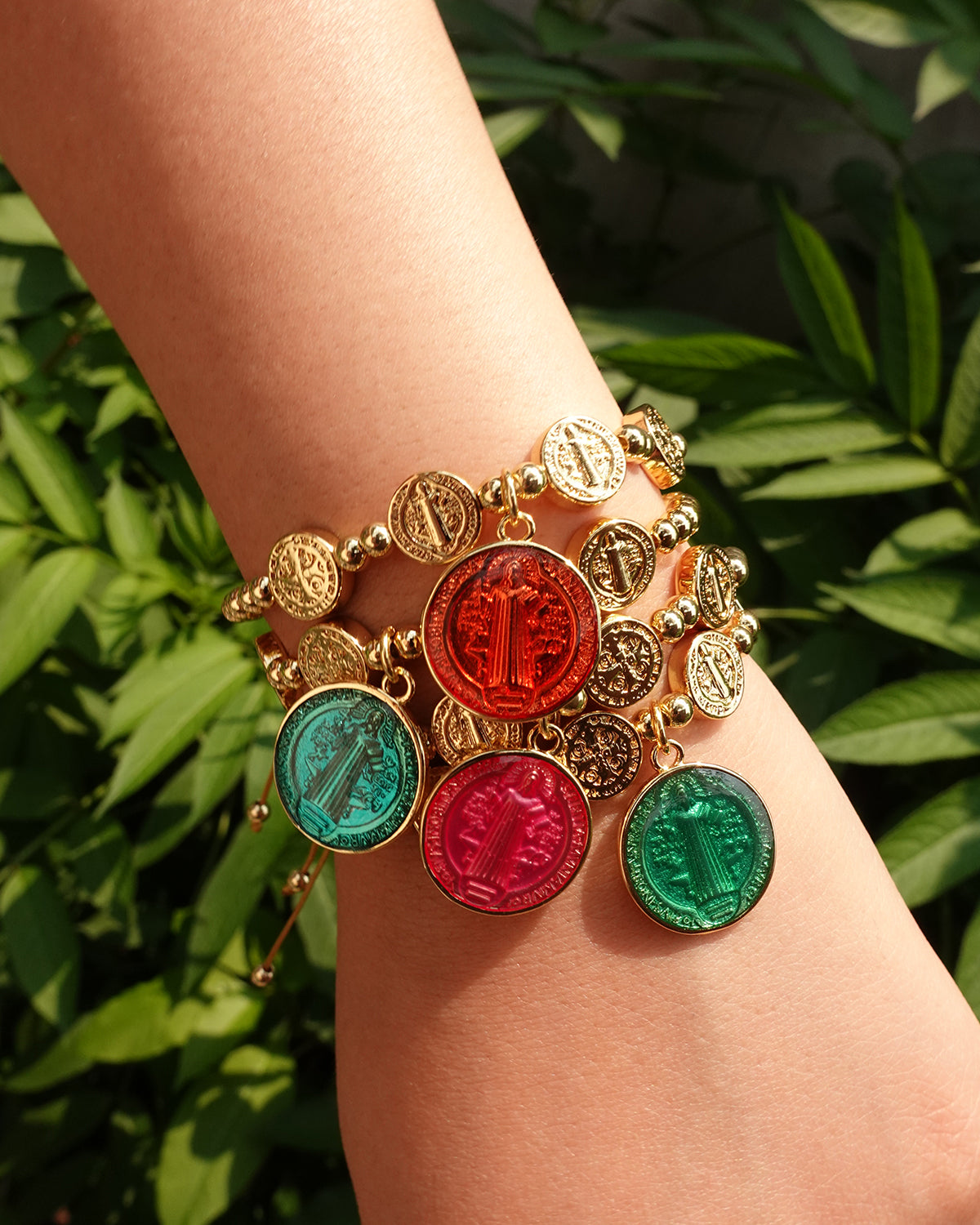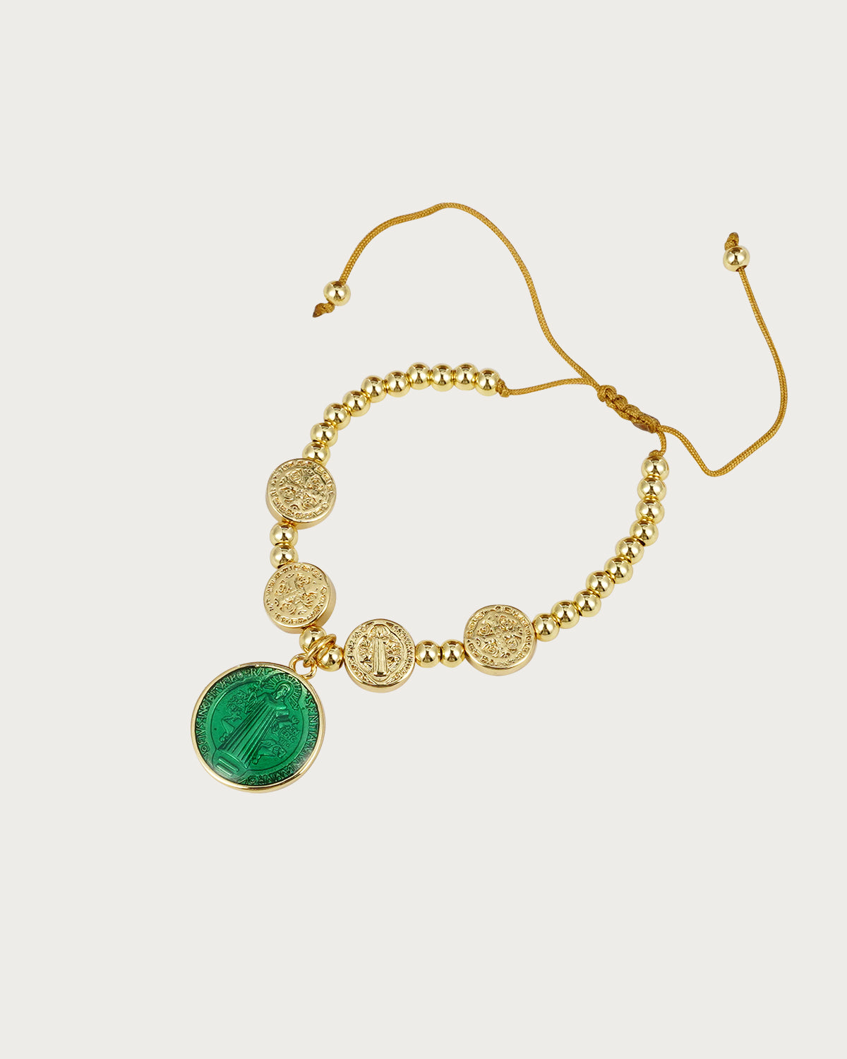 The Virgin Mary Blue Beaded Golden Bracelet combines faith and fashion, featuring a delicate Virgin Mary charm and vibrant green beads for a meaningful accessory.