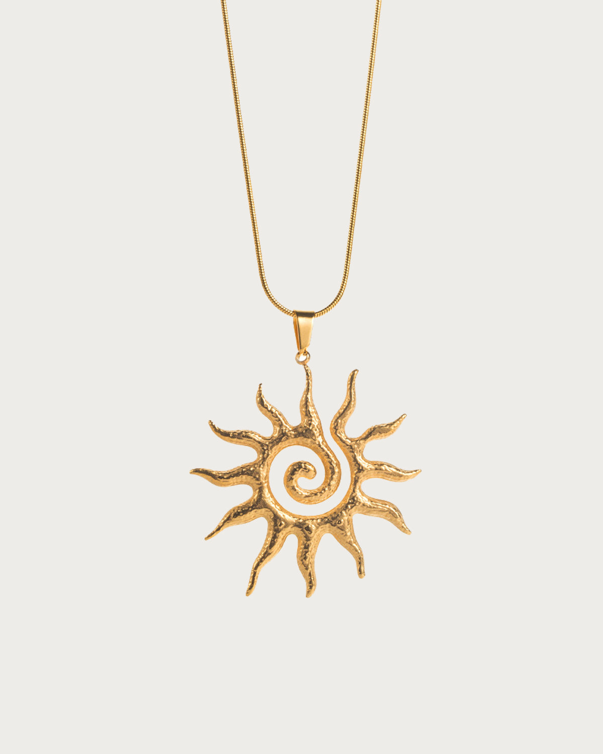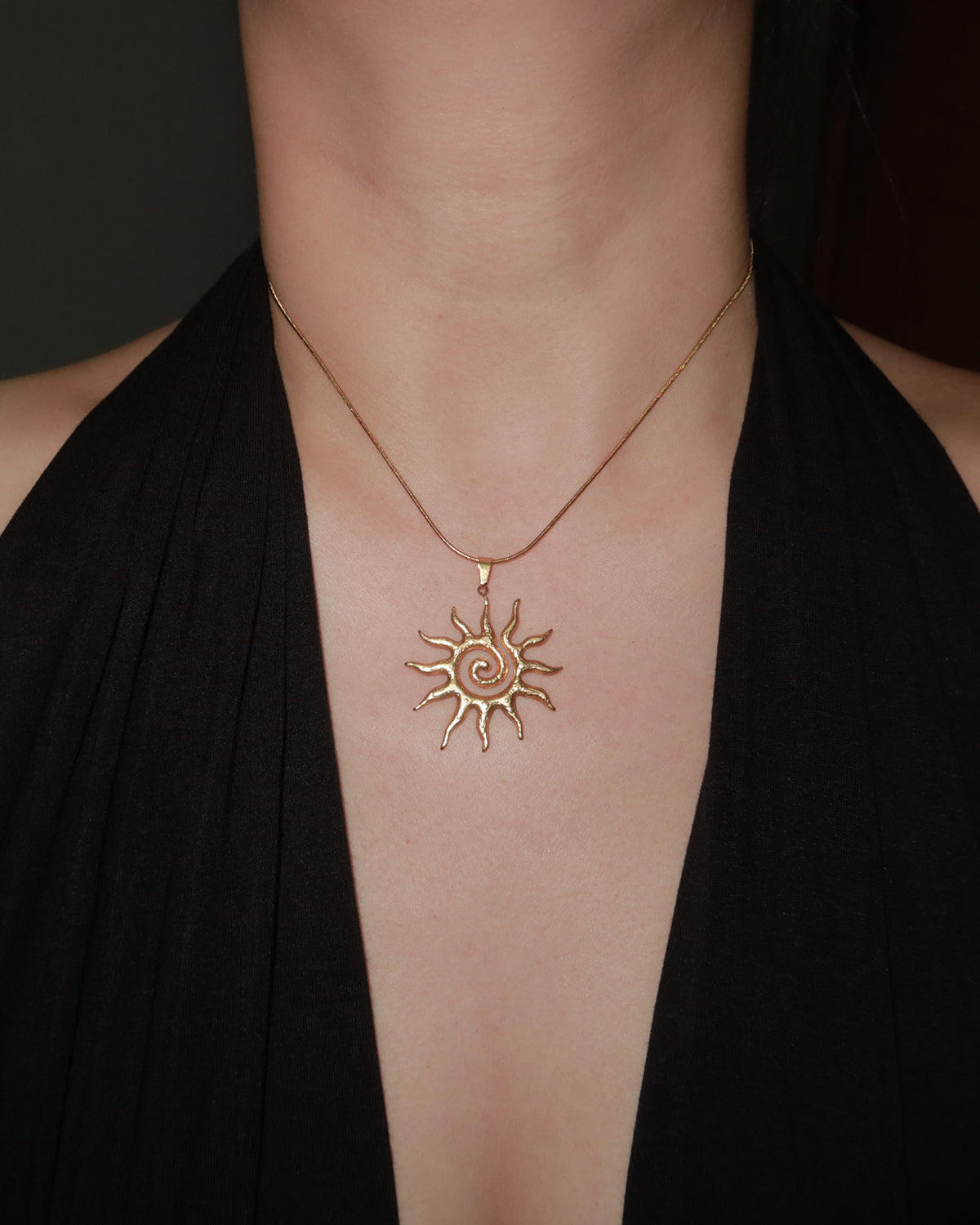 A fine chain with a striking sun pendant creates a perfect balance of subtlety and statement.