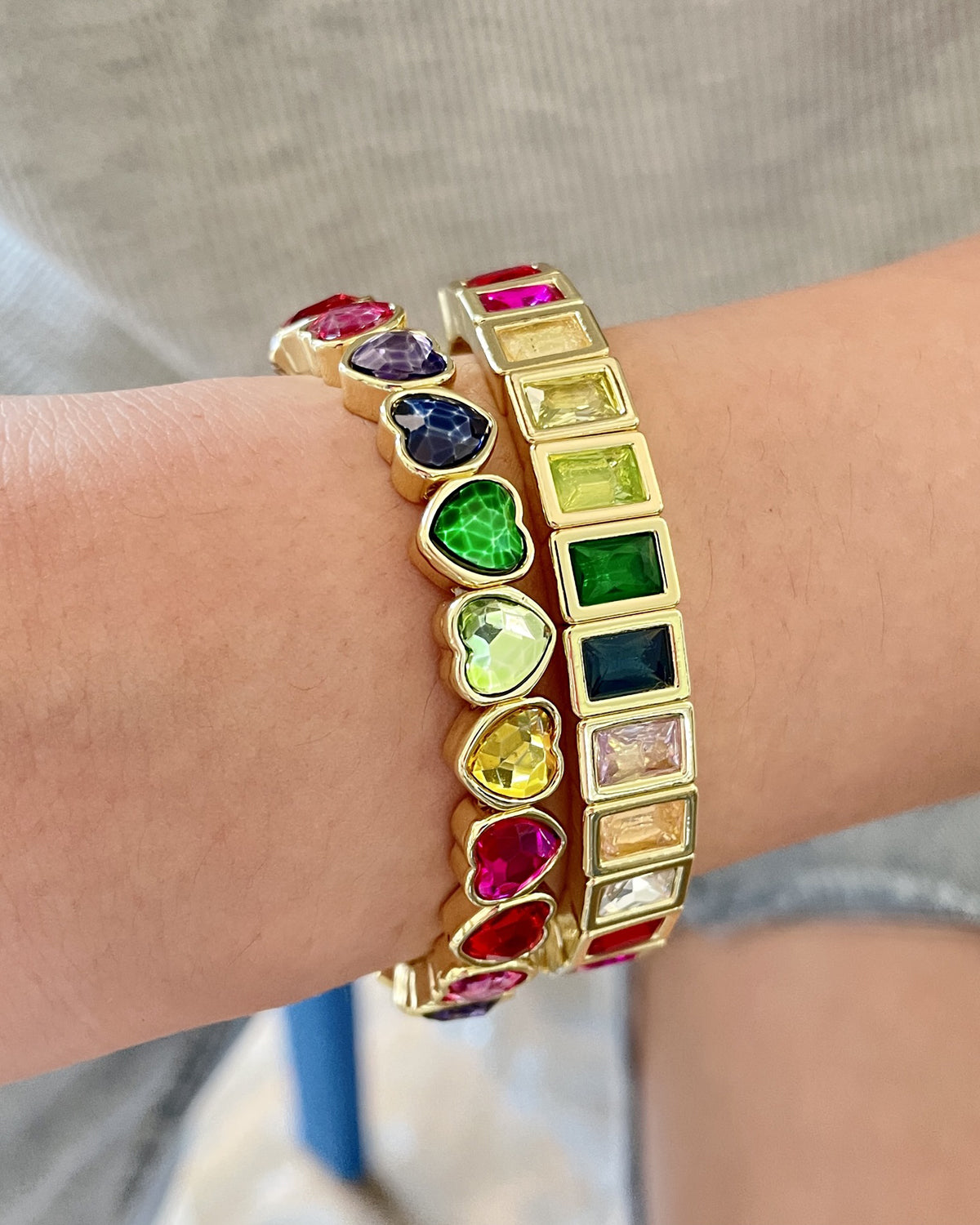 The Rainbow Colorful Heart Gold Bracelet features vibrant enamel rectangles set in a sleek gold band, offering a bold, personalized accessory that adds a pop of color to any outfit.